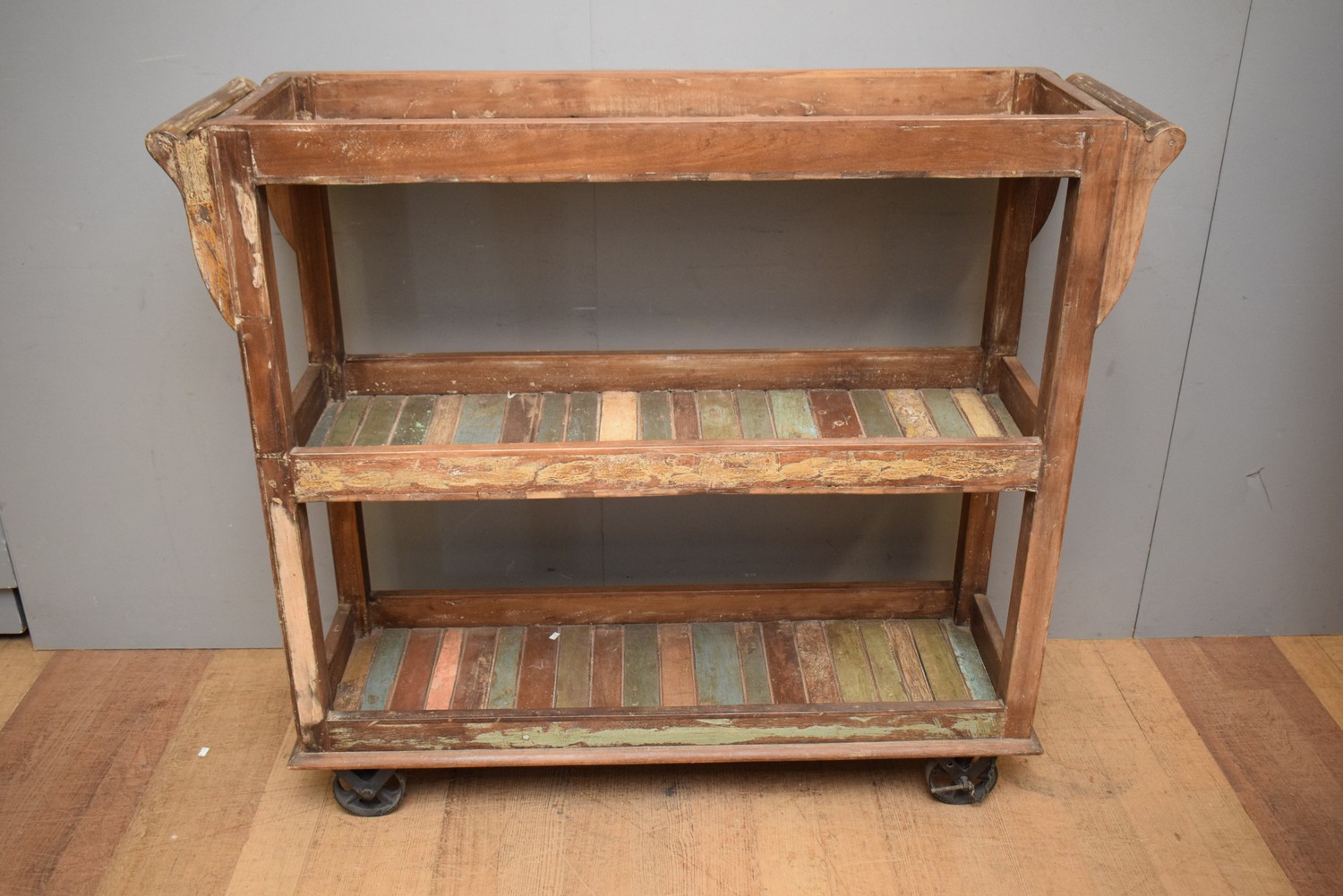 AN INDUSTRIAL THREE TIER TROLLEY (A/F) (118H X 140W X 40D CM)
