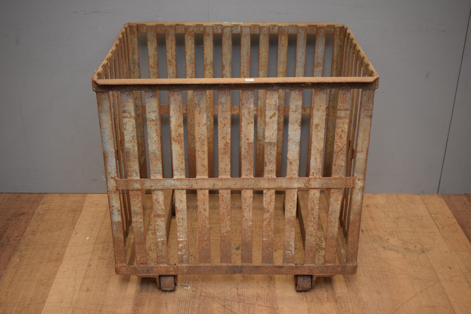 AN INDUSTRIAL STEEL TROLLEY WITH REMOVABLE PERFORATED STEEL BASE (87H X 91W X 71D CM)