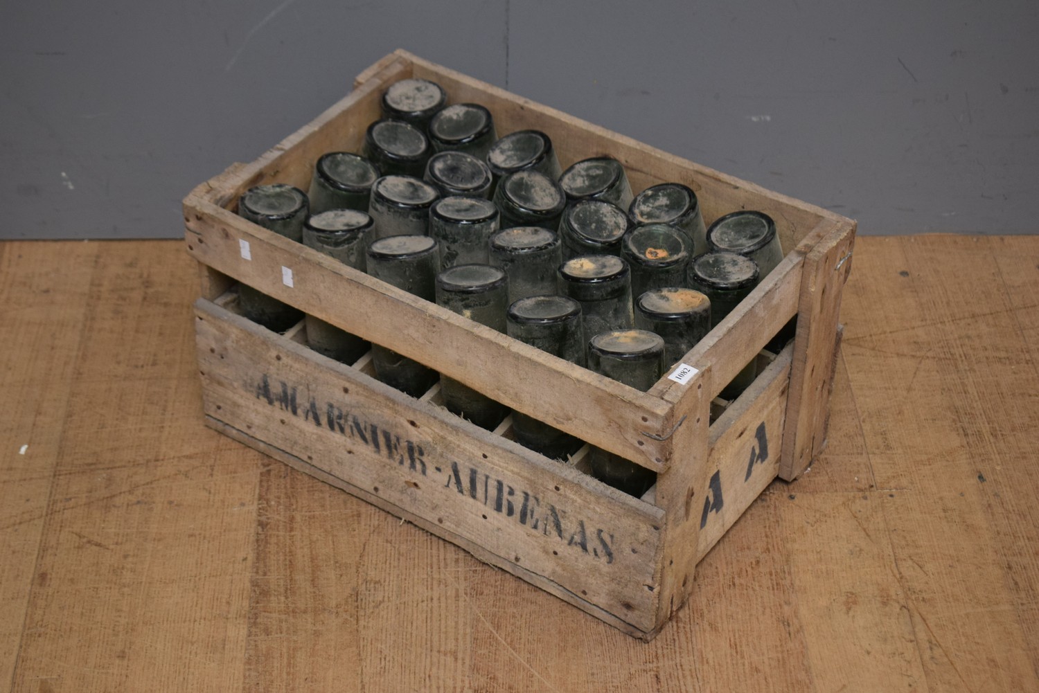 A VINTAGE FRENCH WOODEN CRATE WITH 24 GLASS BOTTLES (CRATE 30H X 56W X 36D CM)