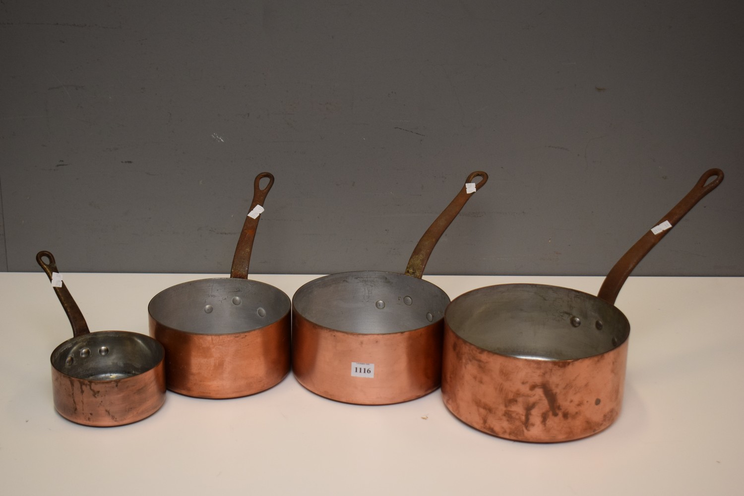 A SET OF FOUR COPPER SAUCEPANS (LARGEST 10H X 20D CM)