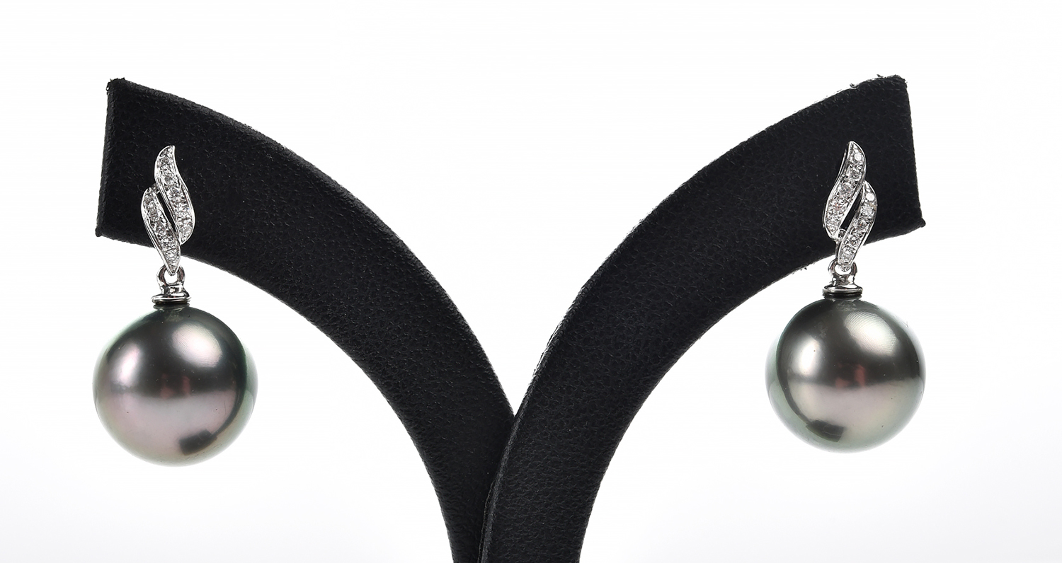 A PAIR OF TAHITIAN PEARL (12.2MM) AND DIAMOND EARRINGS, TO POST AND BUTTERFLY FITTINGS IN 18CT GOLD