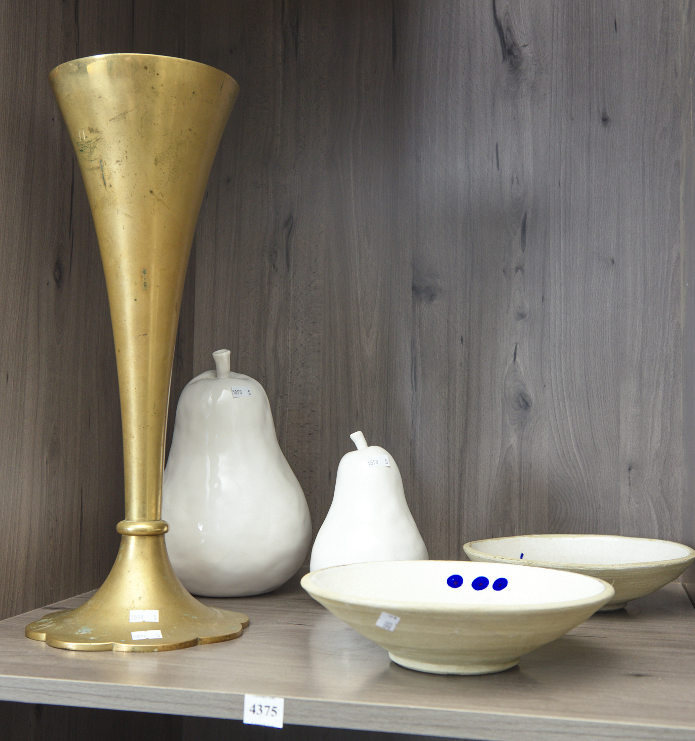 TWO GLAZED CERAMIC PEARS AND TWO ITALIAN GLAZED PLATES AND A BRASS VASE