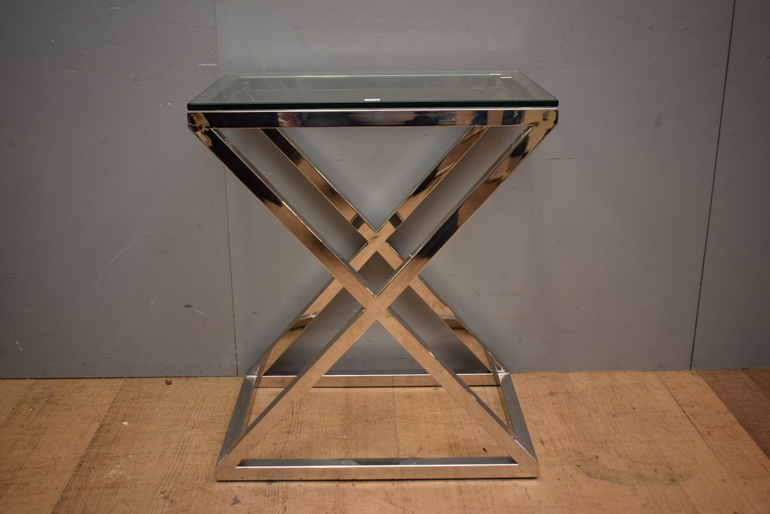A CONTEMPORARY CHROME AND GLASS TABLE (73H X 62W X 42D CM)