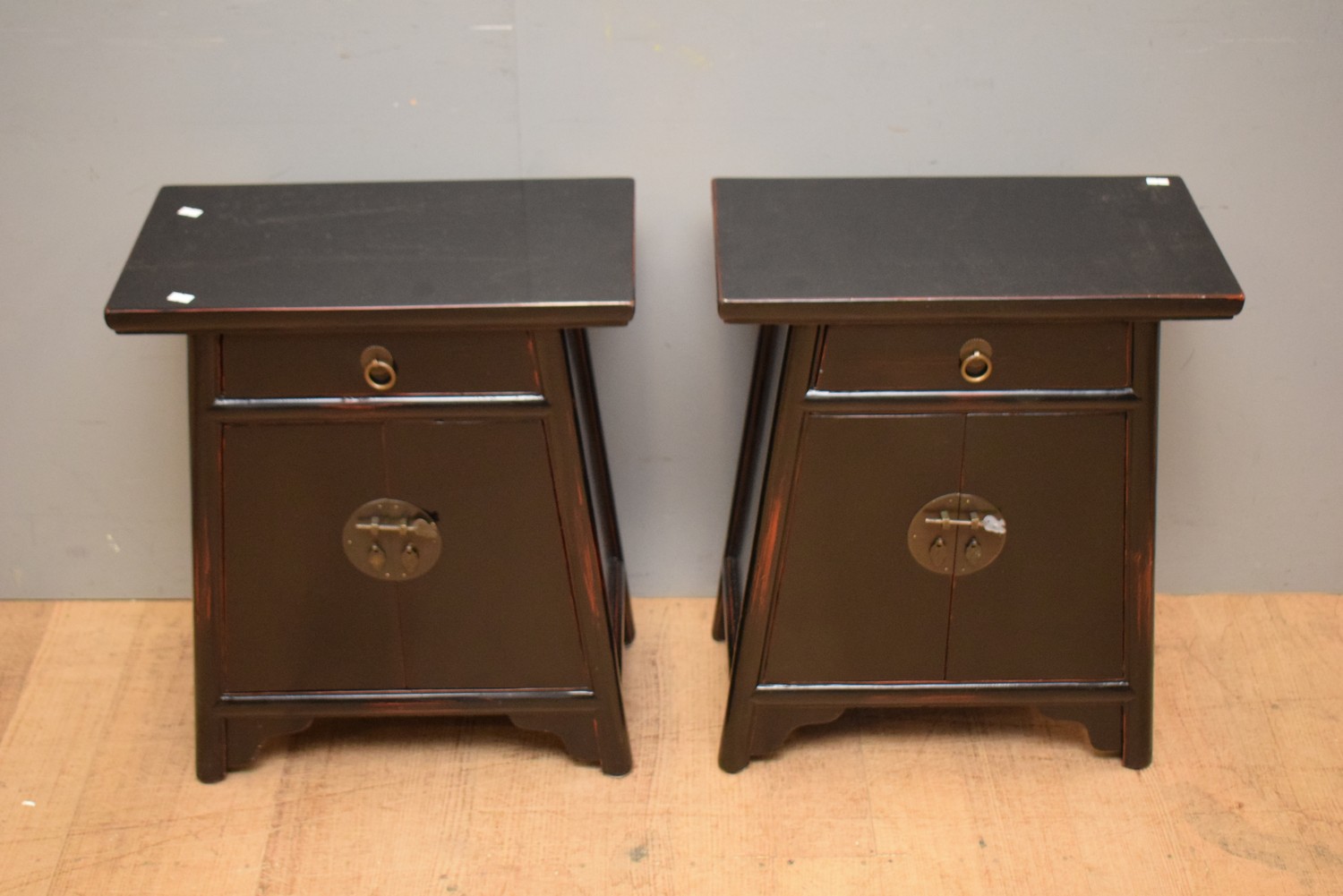A PAIR OF CHINESE EBONISED BEDSIDE CABINETS (60H X 50W X 28D CM)
