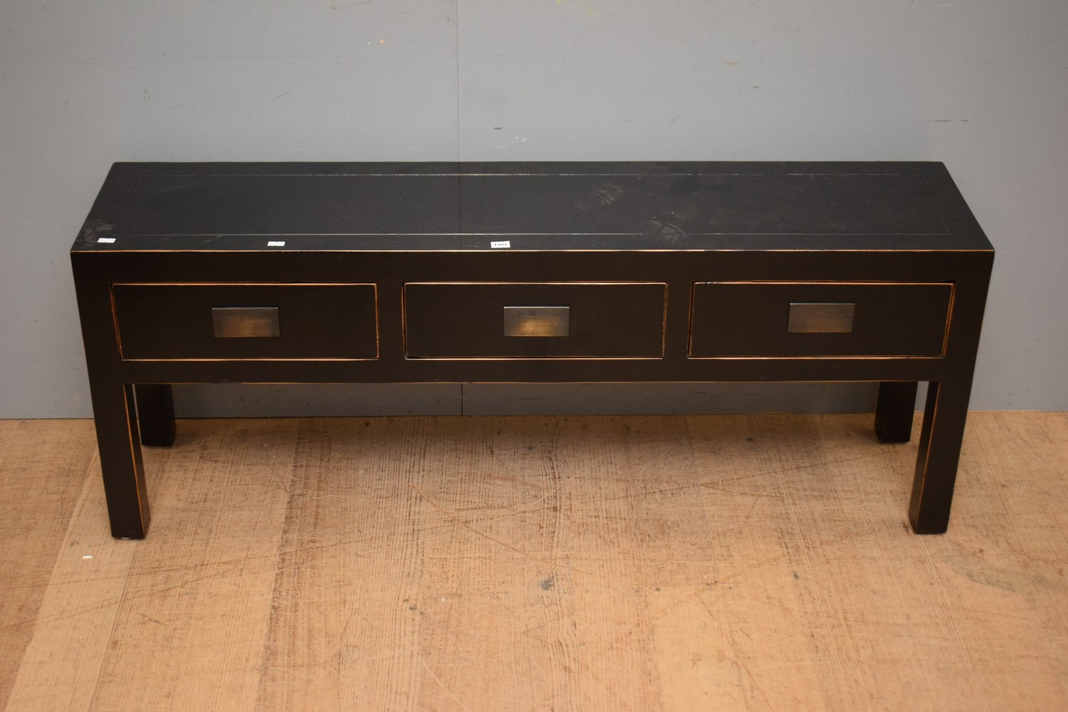 A CHINESE EBONISED LOWLINE THREE DRAWER CABINET (49H X 125W X 30D CM)