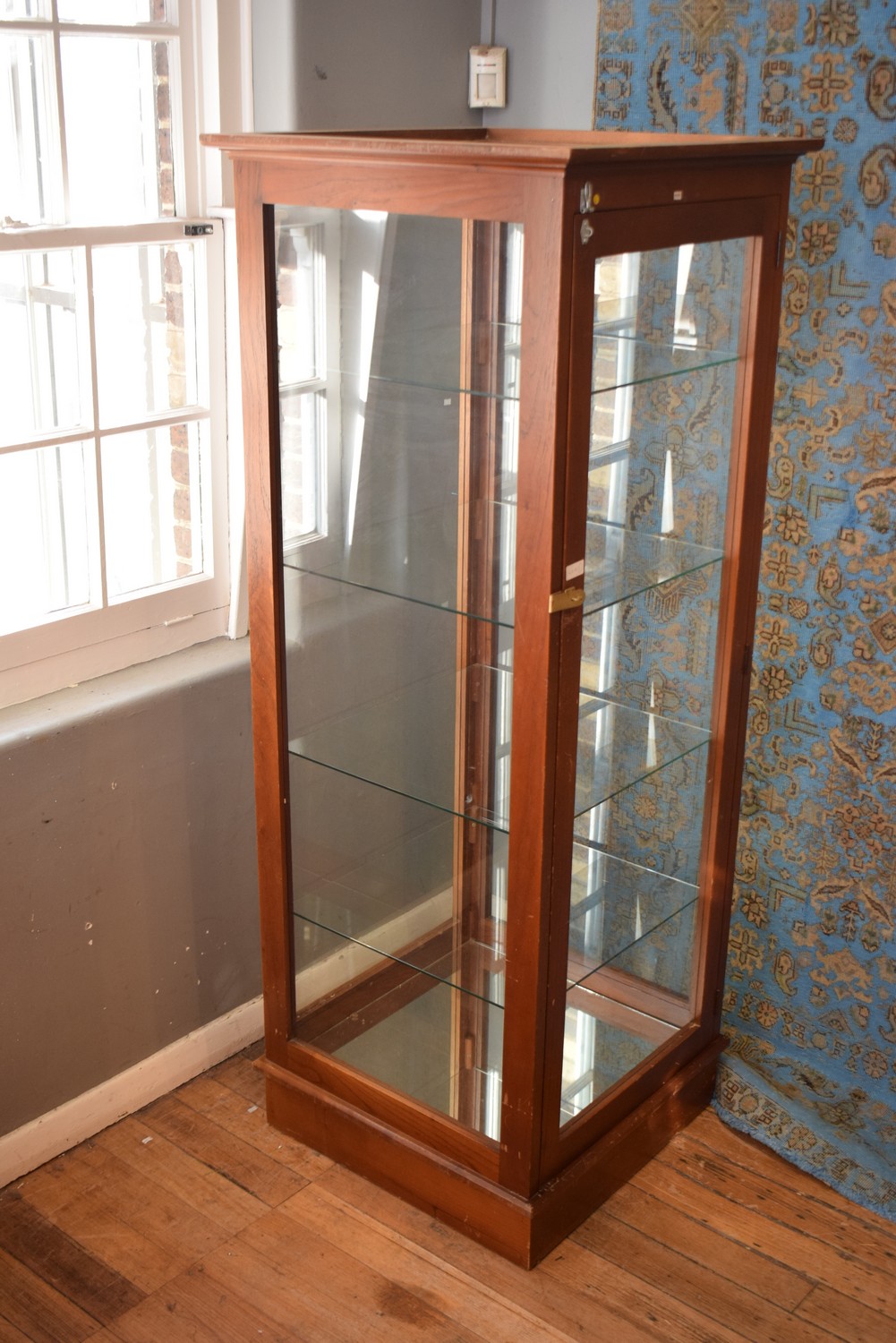 A TIMBER AND GLASS DISPLAY CABINET WITH MIRRORED FLOOR (A/F) (206H X 79W X 79D CM) (PLEASE NOTE THIS HEAVY ITEM MUST BE REMOVED BY CLIENTS OR CARRIERS AT THE CUSTOMERS EXPENSE. LEONARD JOEL STAFF CANNOT ASSIST CARRYING THIS ITEM)