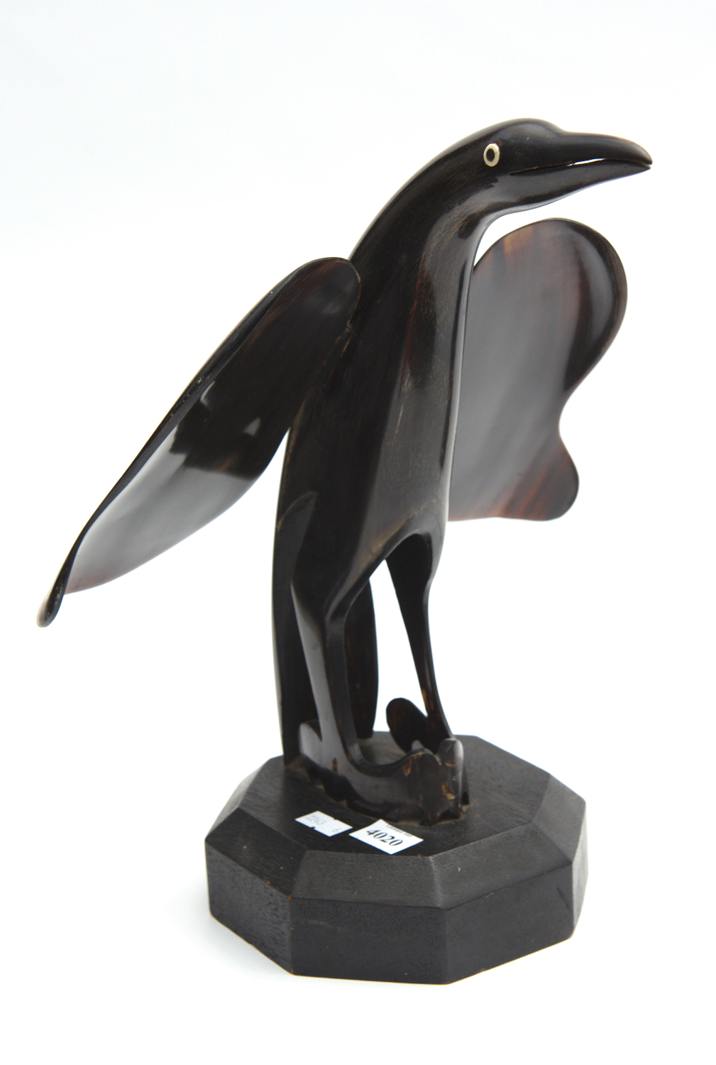 A MID-CENTURY PENGUIN FIGURE HORN ON WOODEN STAND