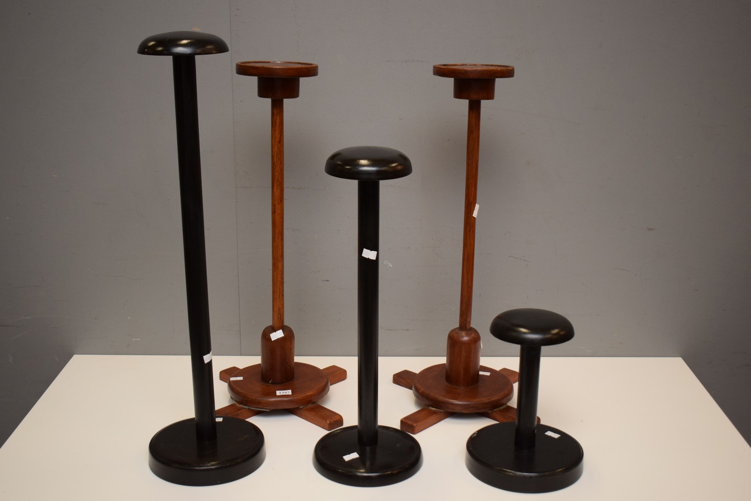 A COLLECTION OF FIVE VINTAGE HAT STANDS (TALLEST 66 CM H)