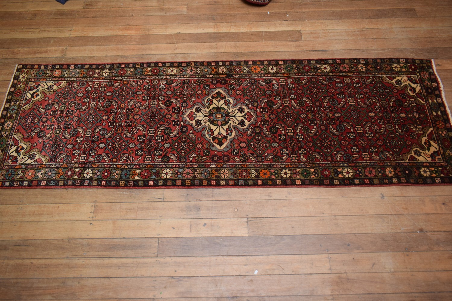 A PERSIAN HOSSAINABAD HALL RUNNER. 100% WOOL. SOLID & DENSE PILE. IN EXCELLENT CONDITION. VILLAGE WEAVE FROM THE HAMADAN REGION WITH TRIBAL DESIGN OF FLORAL MEDALLION IN A RED-TONED FIELD OF BOLD HERATI MAHI PATTERNS. FLORAL-PATTERNED BORDER. SOLID & HARD-WEARING. CERTIFICATE OF AUTHENTICITY INCLUDED. SIZE: 310X102CM, ORIGIN: PERSIA – RRP: $2,100