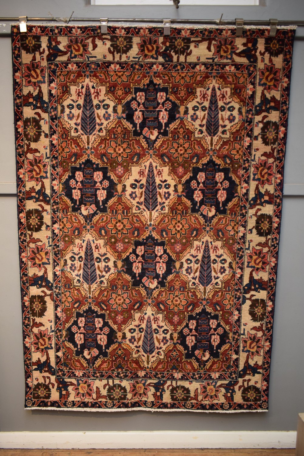A CIRCA 1950s TRIBAL PERSIAN BAKHTIAR CHAHALSHOTOR RUG. 100% WOOL. NATURAL DYES. ANTIQUE PILE. EX-GALLERY INVENTORY. FULLY RESTORED. FINELY HAND-KNOTTED BAKHTAIRI WEAVE WITH TRADITIONAL PICTORIAL 'GARDEN' DESIGN WITH PANELS CONTAINING CYPRESS & FIR TREES FLOWER HEADS. BORDER OF PALMETTES & ROSETTES. CERTIFICATE OF AUTHENTICITY INCLUDED. SIZE: 209X142CM, ORIGIN: PERSIA – RRP: $4,400