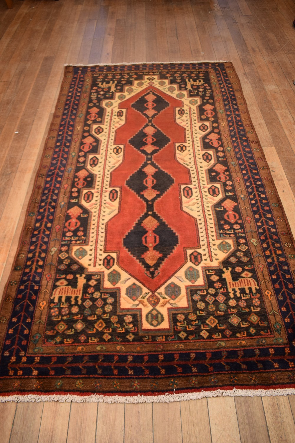 A PERSIAN SONQOR KOLYAIE RUG. 100% WOOL. NATURAL DYES. VINTAGE PILE. IN GOOD CONDITION. VILLAGE WEAVE WITH TRIBAL DESIGN OF HOOKED MEDALLIONS IN A PRIMARY OPEN TERRACOTTA-TONED FIELD, SECONDARY CREAM FIELD OF 'TREE OF LIFE' PATTERNS & TERTIARY FIELD OF GEOMETRIC & FLORAL PATTERNS & ANIMAL FORMS. BORDER OF 'TREE OF LIFE' PATTERNS. CERTIFICATE OF AUTHENTICITY INCLUDED. SIZE: 278X150CM, ORIGIN: PERSIA – RRP: $3,200