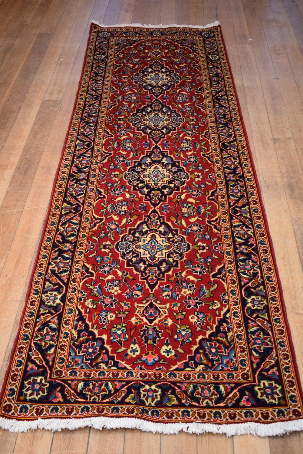 A FINELY HAND-KNOTTED PERSIAN KASHAN HALL RUNNER, 100% WOOL. DENSE PILE. EX-GALLERY STOCK. CLASSIC KASHAN BOOK-COVER DESIGN OF REPEATING ELONGATED FLORAL MEDALLIONS IN A RED FIELD OF SHAH ABBASSI PALMETTES, FLORAL MOTIFS & TENDRILS. BORDER OF PALMETTES AND TENDRILS. STURDY & HARD-WEARING. CERTIFICATE OF AUTHENTICITY INCLUDED. SIZE: 308X97CM, ORIGIN: KASHAN/PERSIA – RRP: $2,200