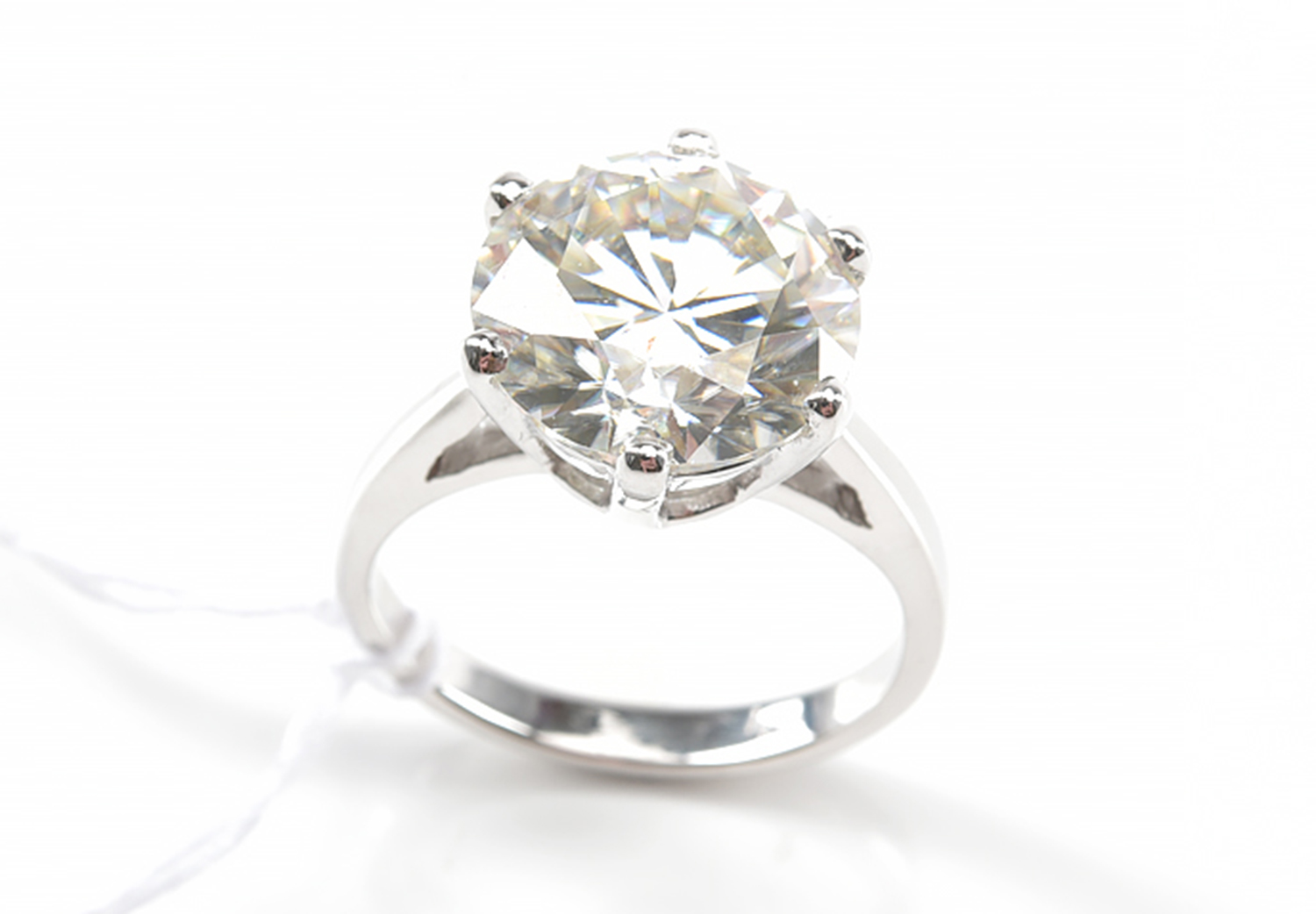 A MOISSANITE SOLITAIRE RING IN 18CT WHITE GOLD, THE MOISSANITE WEIGHING 6.02CTS, RING SIZE M