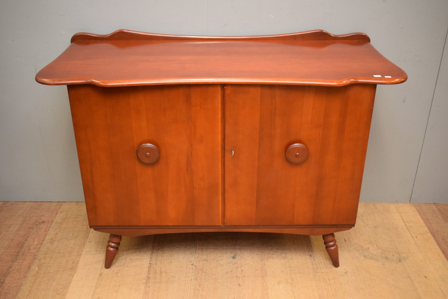 A RARE AND ORIGINAL MID-CENTURY MODERN SOLID TASMANIAN MYRTLE CABINET CREATED BY THE MYER HERITAGE STUDIO IN 1953 WITH ATOMIC SPLAY LEGS AND LARGE, ROUND HANDLES (97H X 140W X 56D CM)