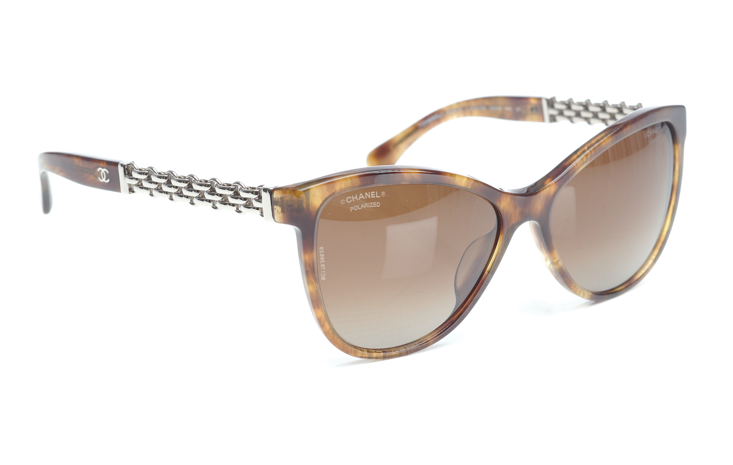Styled in tortoise shell composite with white metal chain feature to arms, boxed with case.