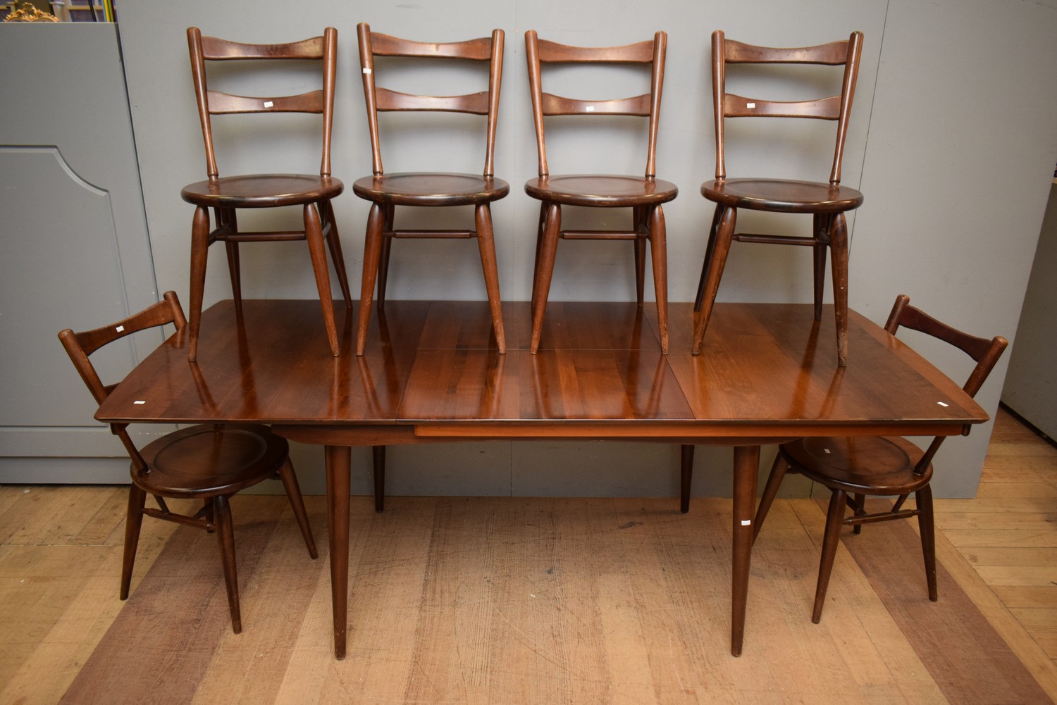 A MYER HERITAGE MID-CENTURY SEVEN PIECE EXTENSION DINING SUITE (TABLE 76H X EXTENDED 213W X 91D CM) (A/F TO TABLE SURFACE)