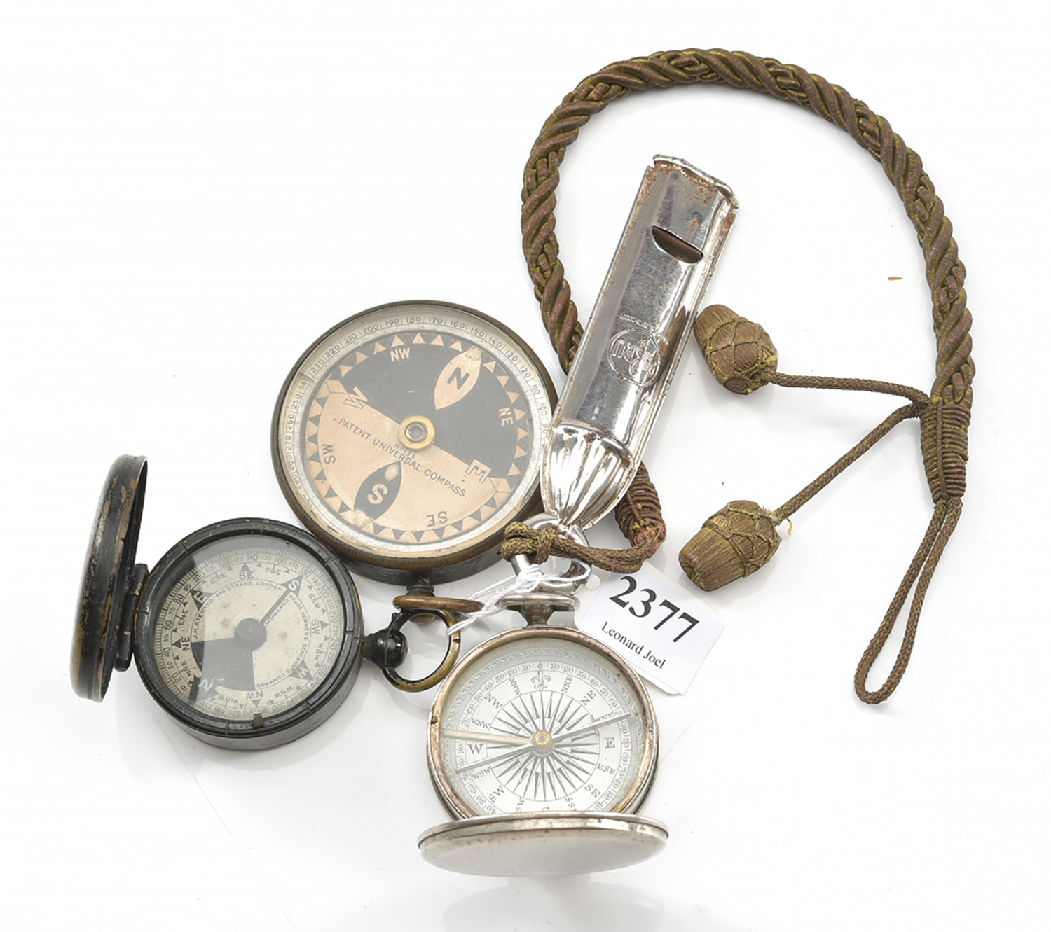THREE VINTAGE COMPASSES IN GUNMETAL, BRASS AND CHROME TOGETHER WITH A WHISTLE