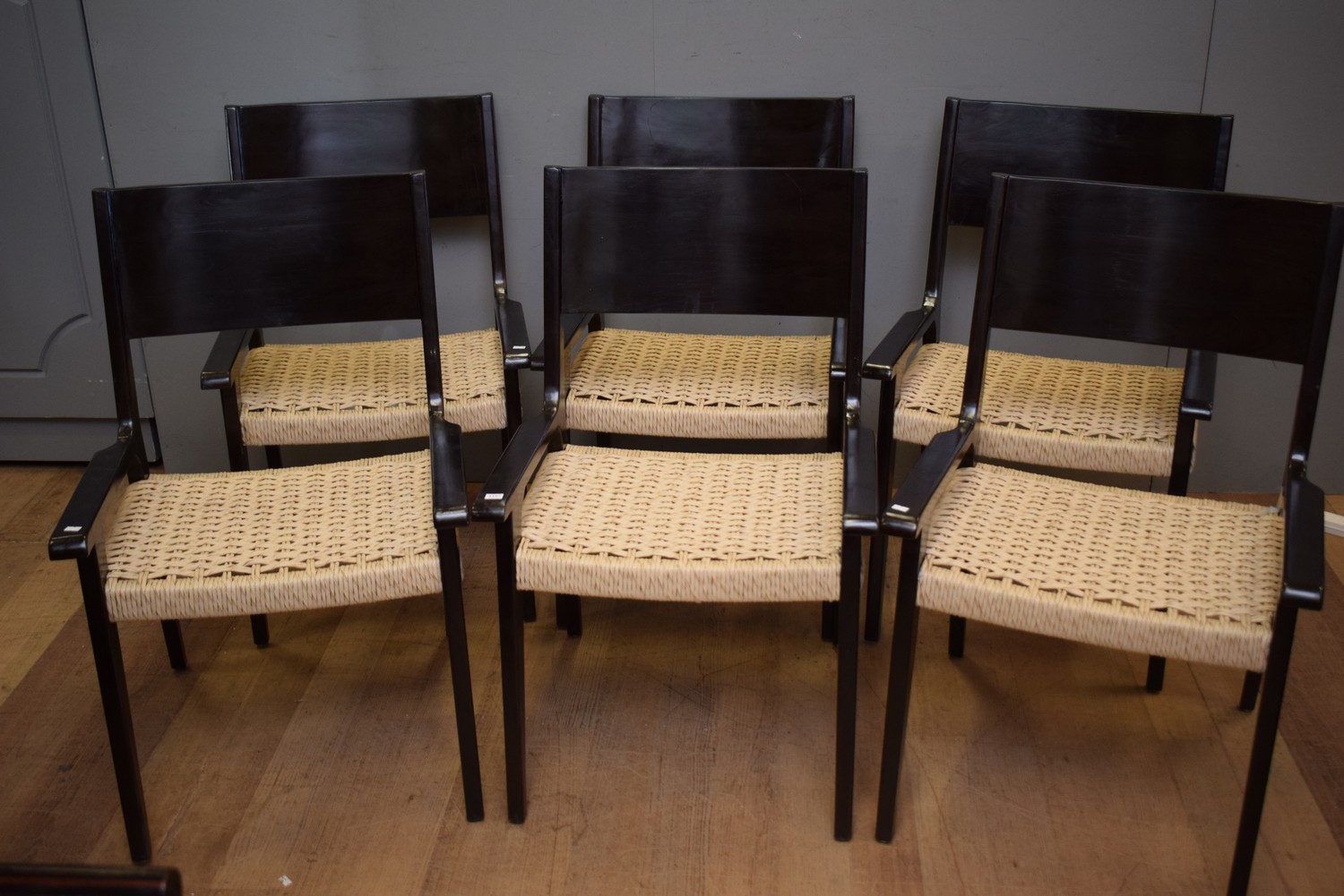 SIX EBONISED TEAK DINING CHAIRS (91H X 59W X 60D CM)