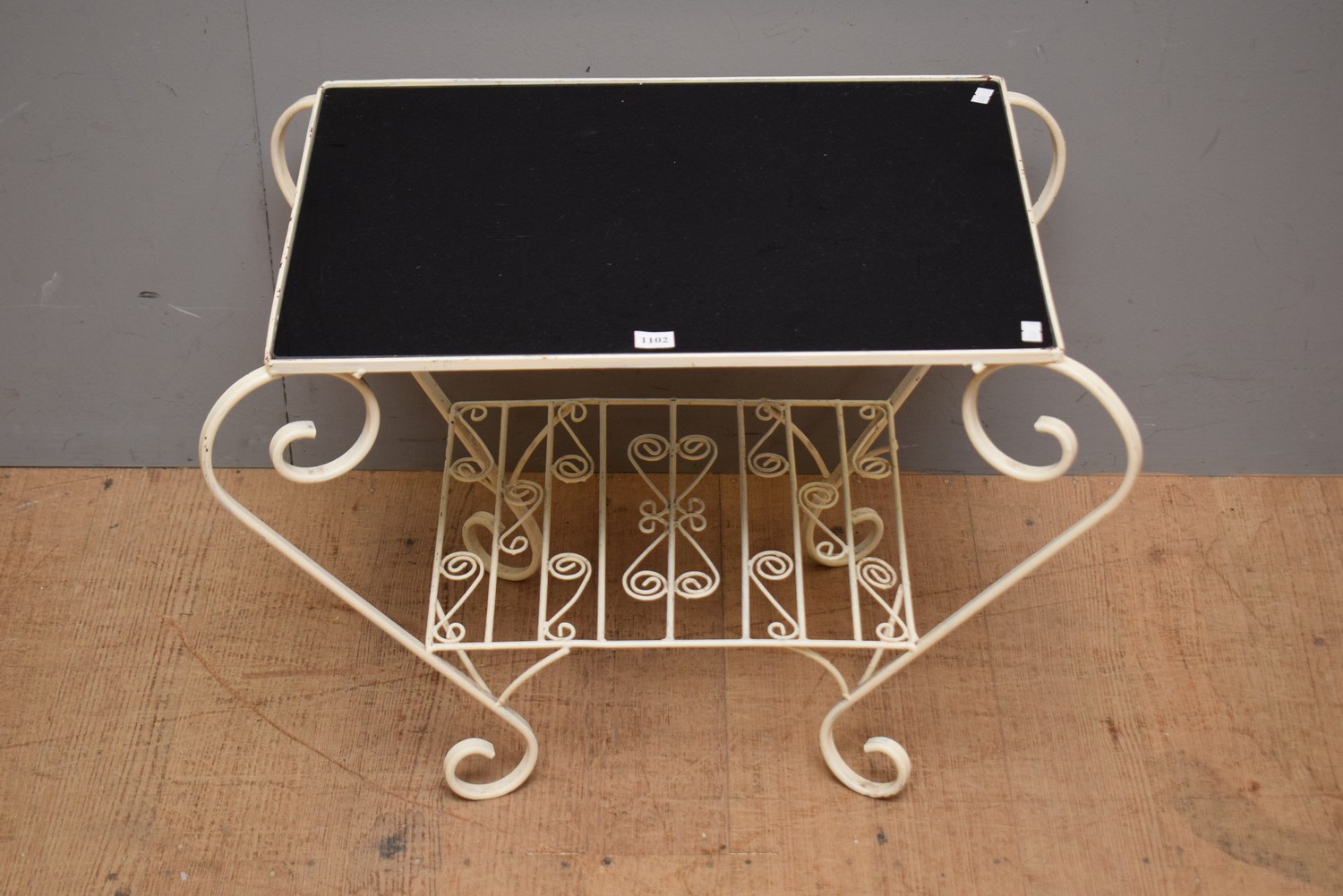 A 1940S WROUGHT IRON TWO TIER TABLE WITH ORIGINAL BLACK GLASS (44H X 62W X 40D CM)