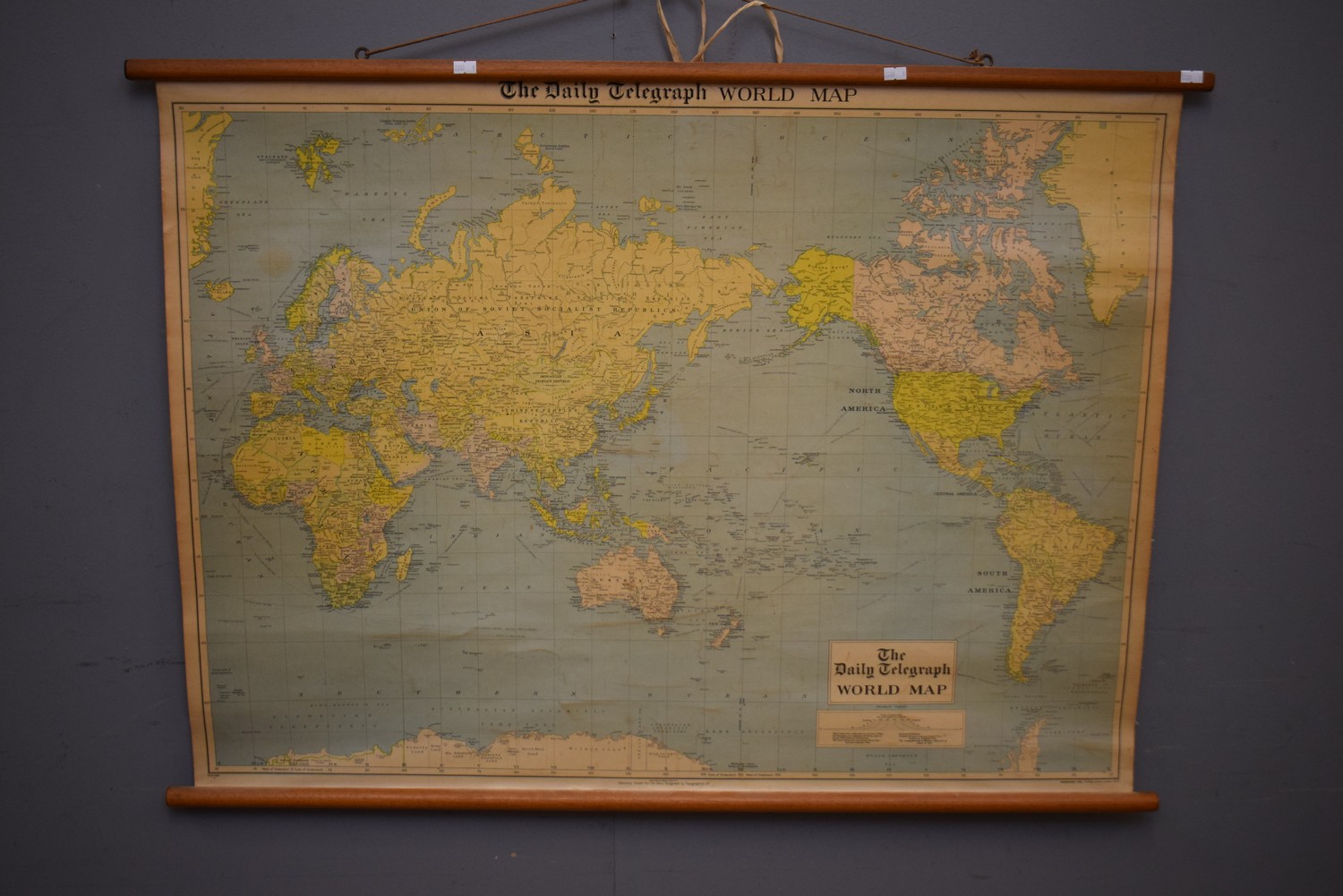 A 1940S WOODEN MOUNTED 'DAILY TELEGRAPH' WORLD MAP (79 X 107 CM)