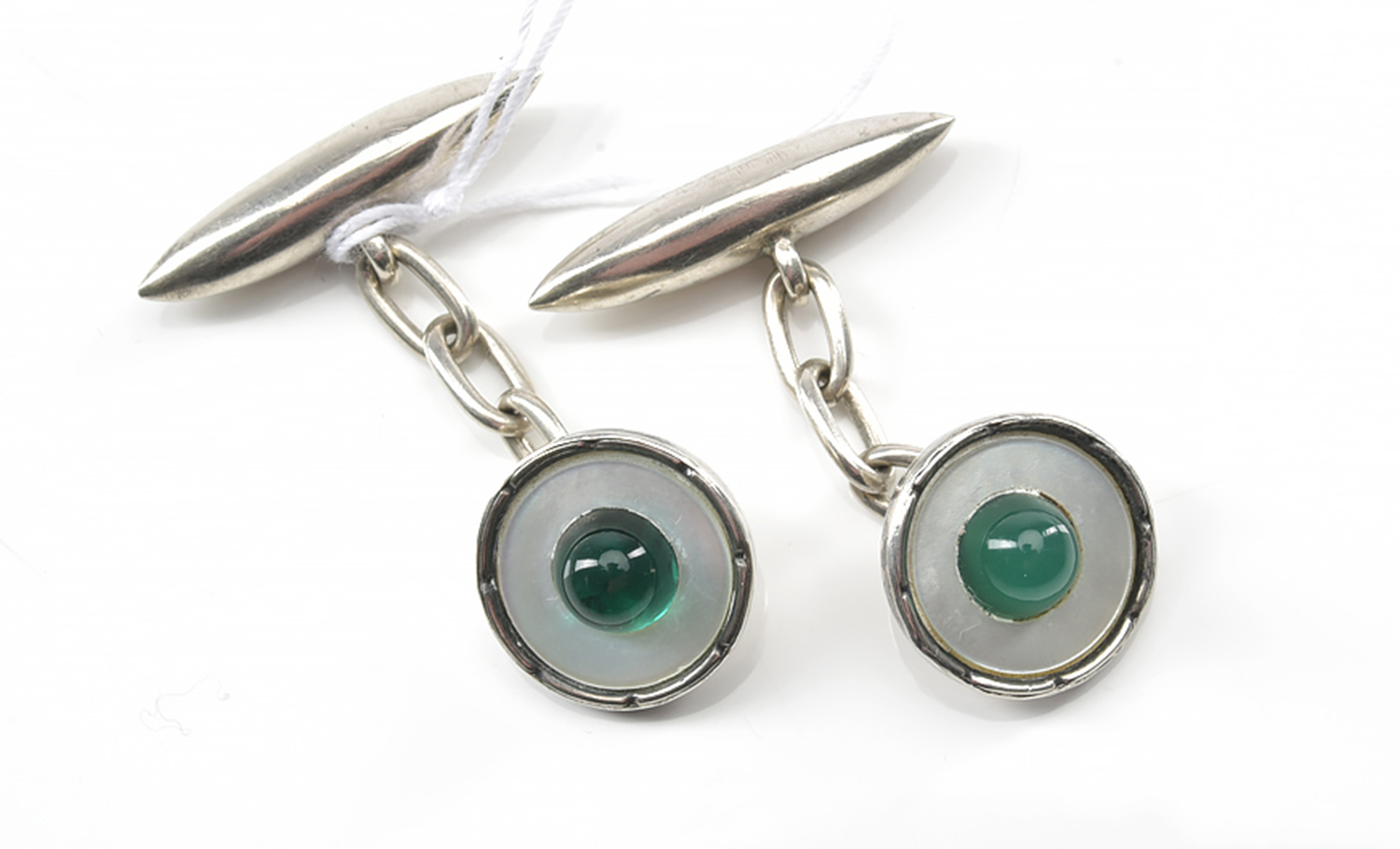 A PAIR OF MOTHER OF PEARL AND GREEN PASTE CUFFLINKS IN STERLING SILVER