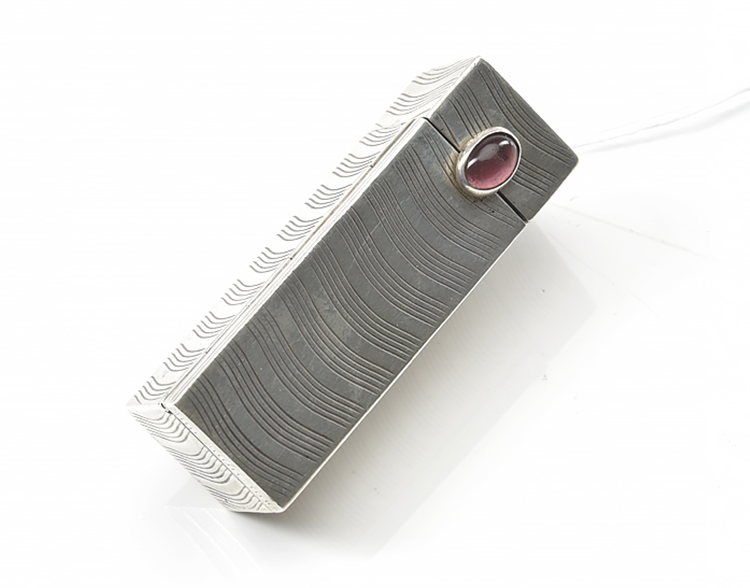 A 1950s LIPSTICK CASE IN CONTINENTAL SILVER, OF RECTANGULAR SHAPE, OPENING ON A LITTLE MIRROR AND SET WITH A PINK STONE CABOCHON, TOTAL LENGTH 56MM