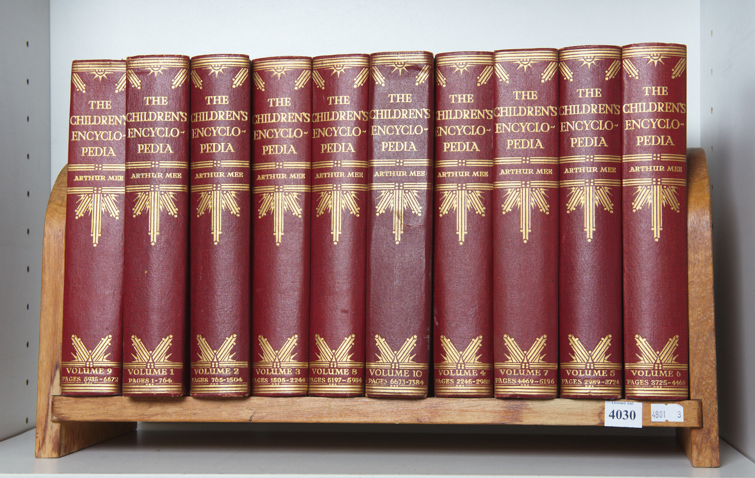 TEN VOLUMES OF THE CHILDREN'S ENCYCLOPEDIA IN A HARDWOOD BOOK STAND