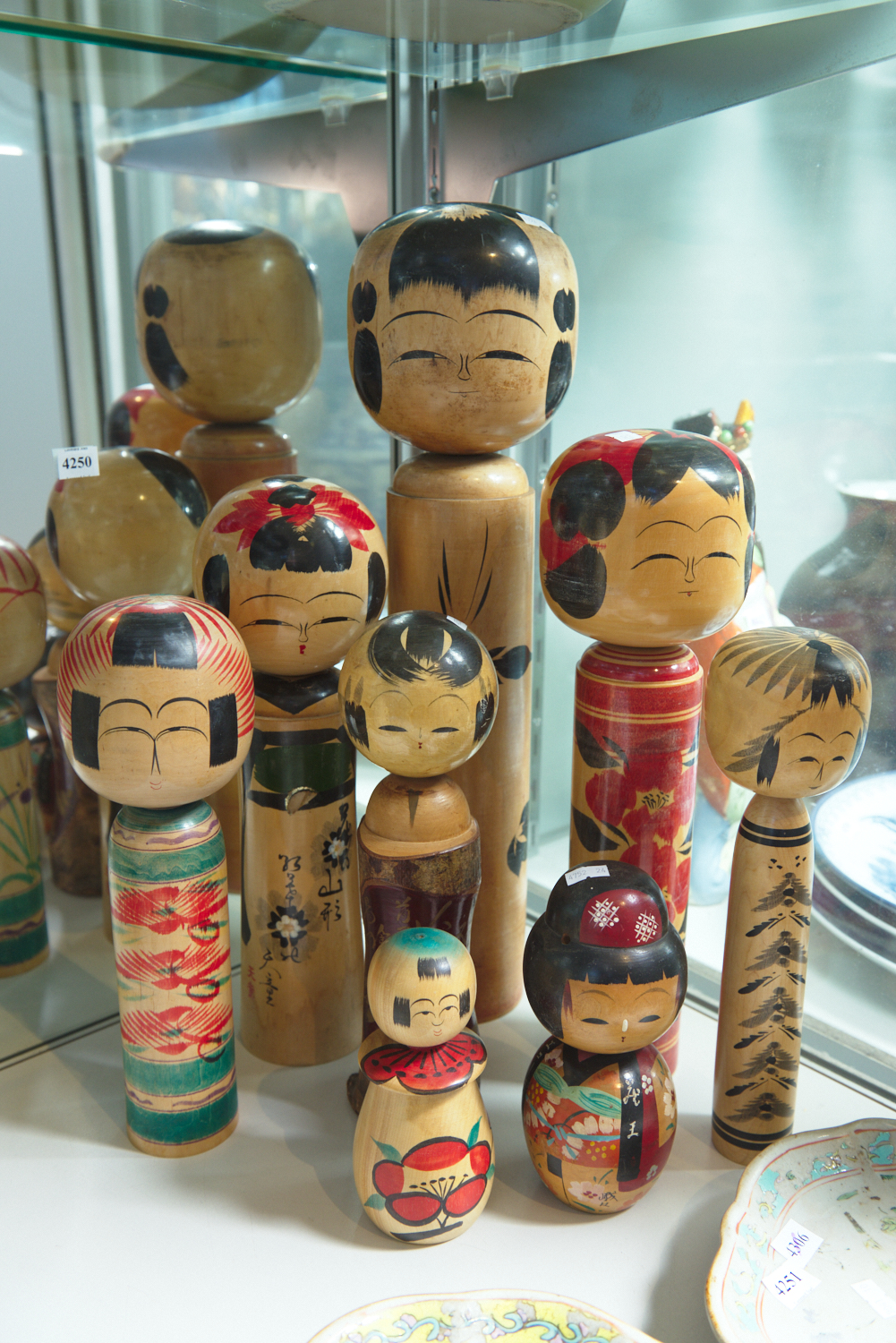 A COLLECTION OF EIGHT VINTAGE WOODEN JAPANESE KOKESHI DOLLS, EACH DOLL HANDPAINTED AND SIGNED