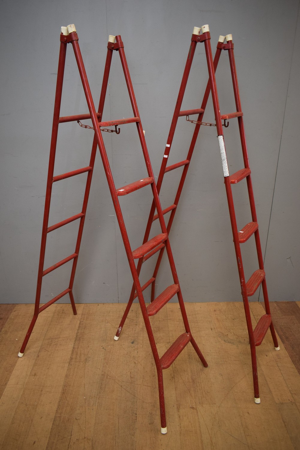 TWO RED METAL INDUSTRIAL LADDERS (182H X 35W CM)