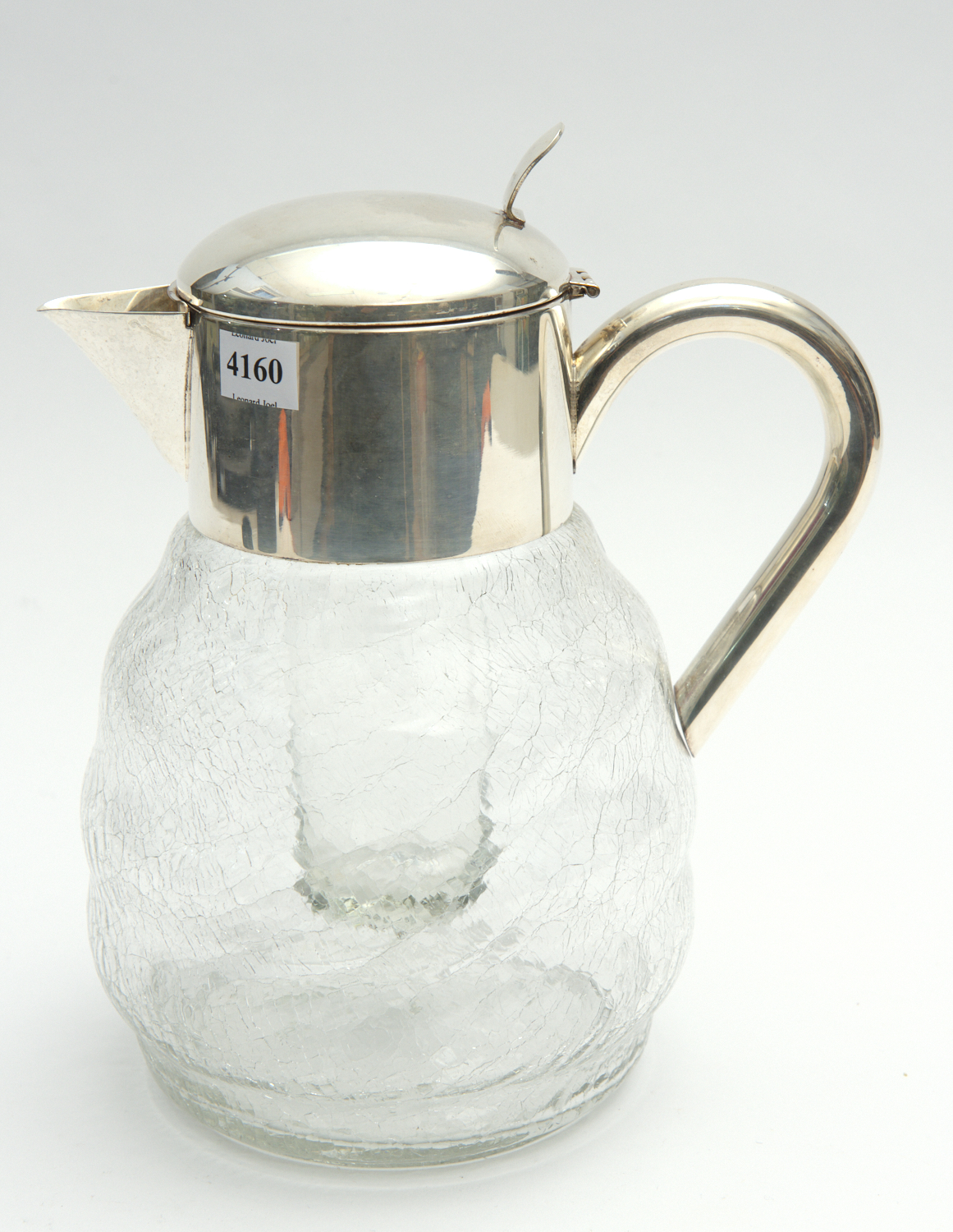 A CRACKLE GLASS AND SILVER PLATE WATER JUG WITH LINER FOR ICE