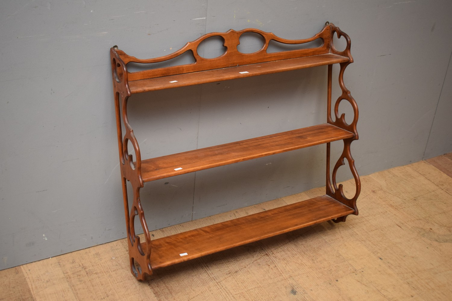 A THREE TIER TIMBER WALL MOUNTED SHELF (71H X 76W X 18D CM)