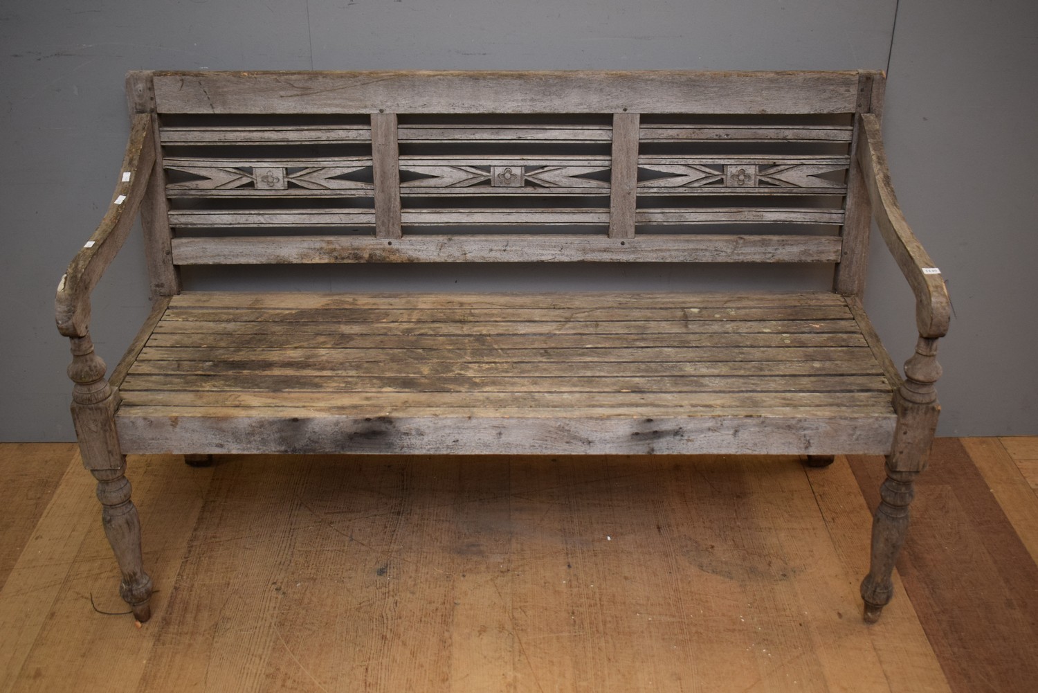 A TEAK OUTDOOR THREE SEATER BENCH (A/F) (88H X 140W X 55D CM)