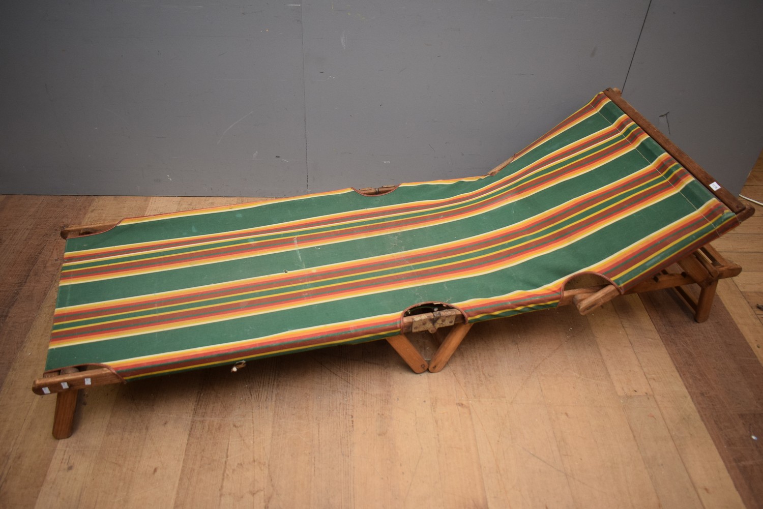 A MID-CENTURY FOLDABLE LOUNGER (A/F, DAMAGE TO FRAME, HOLES TO FABRIC) (50H ADJUSTABLE X 192W X 64D CM)