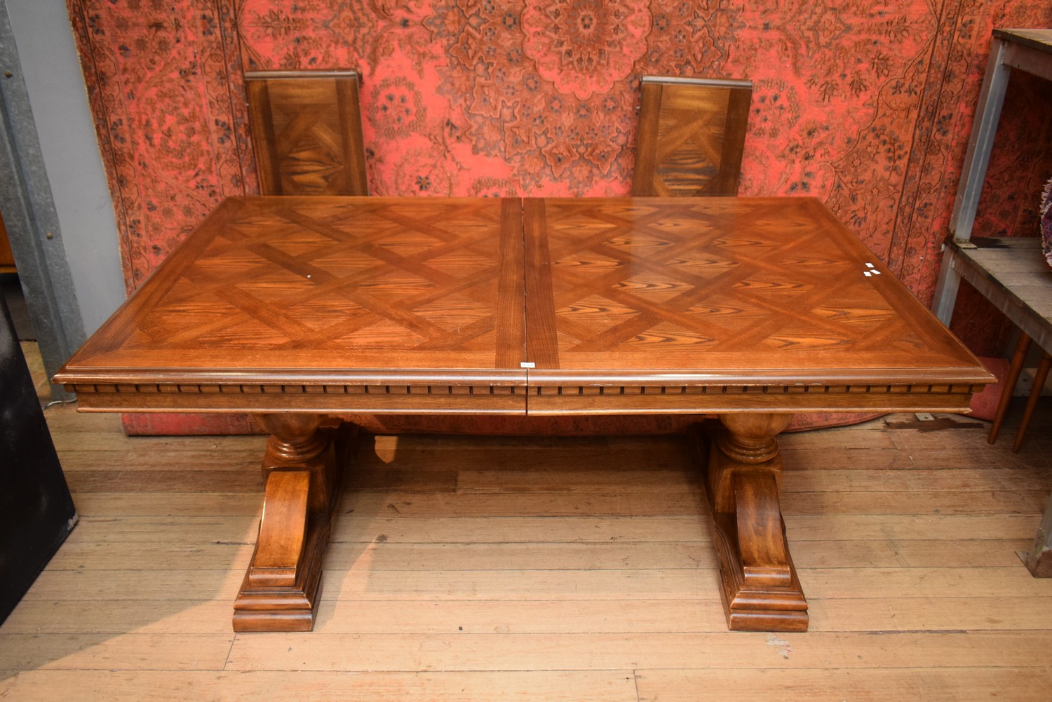 A PARQUETRY TOP EXTENSION DINING TABLE WITH TWO LEAVES (A/F) (77H X 233W EXTENDED X 106D CM)