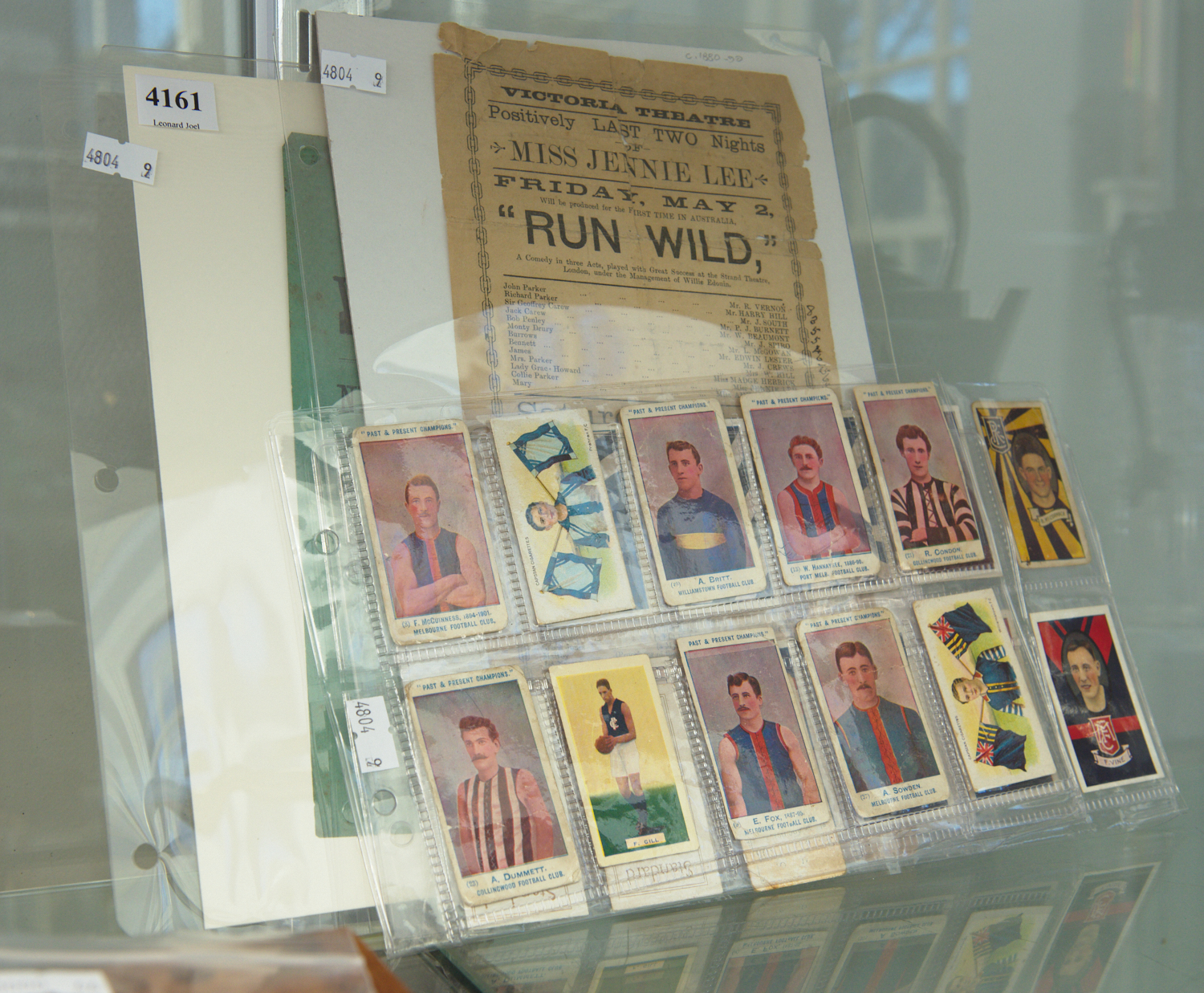 A COLLECTION OF EPHEMERA INCLUDING TWO THEATRE BROADSIDES AND A COLLECTION OF 23 VINTAGE AFL CIGARETTE CARDS, INCLUDING 'TURF', 'CAPSTAIN' AND 'STANDARD'