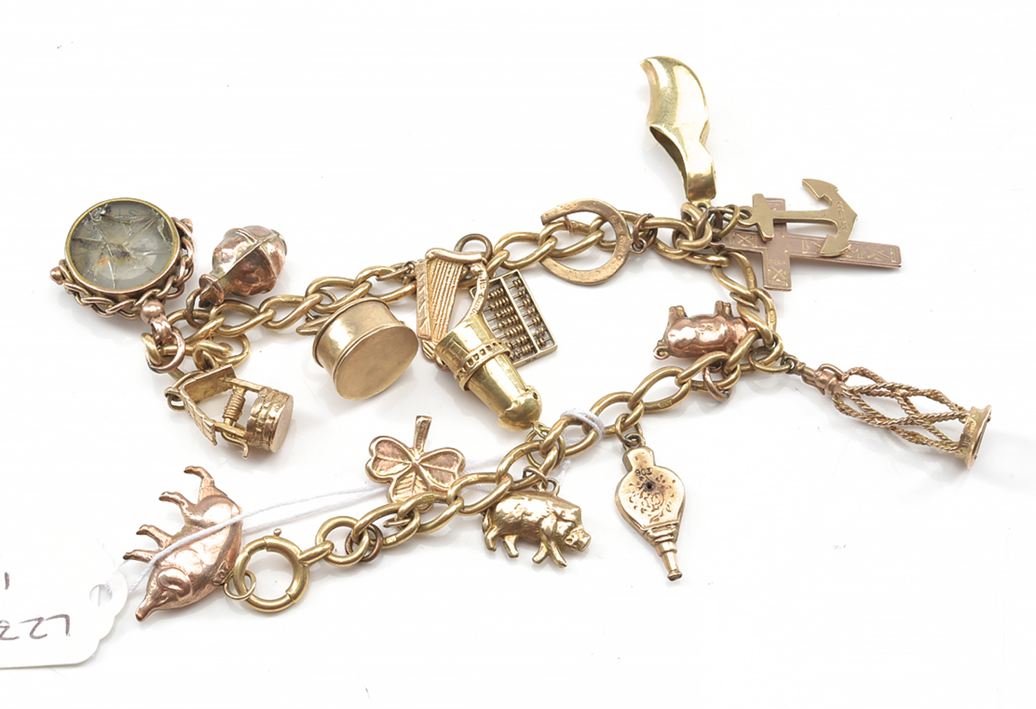A CHARM BRACELET IN 18CT GOLD WITH CHARMS IN ASSORTED CARAT WEIGHTS, 42.58 GRAMS