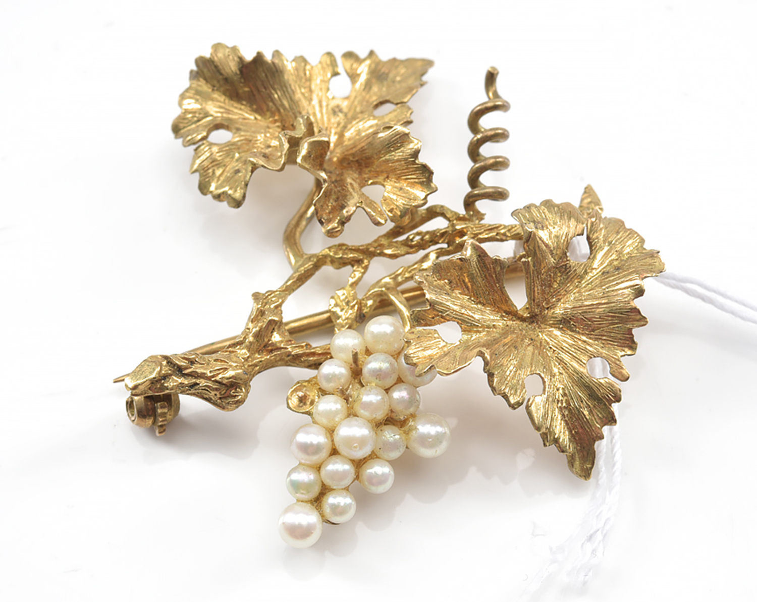 A CULTURED PEARL GRAPE VINE DESIGN BROOCH IN 18CT GOLD, 9.5GMS
