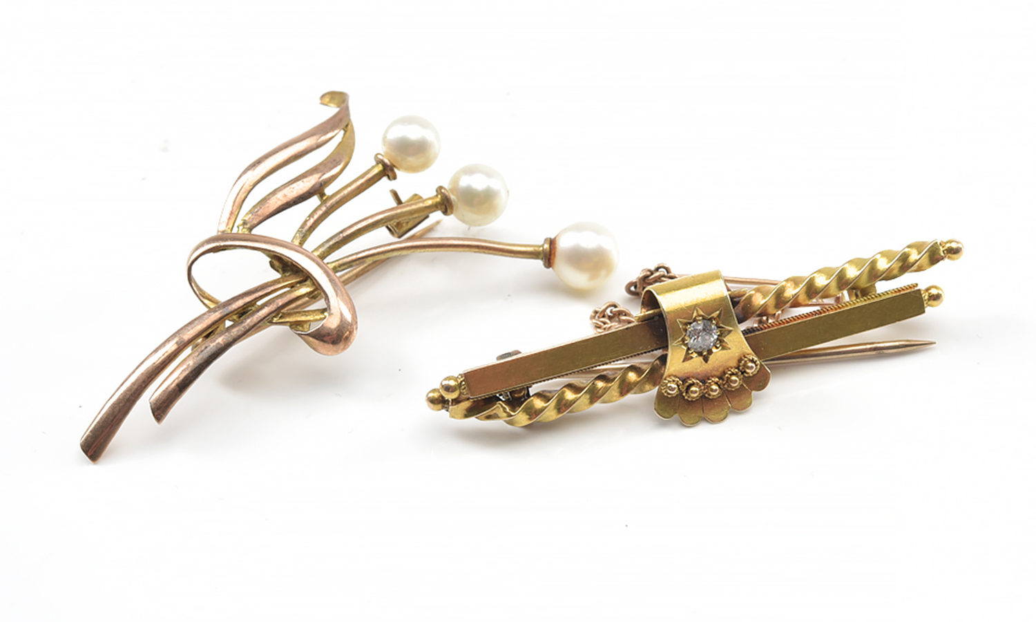TWO BROOCHES INCLUDING A DIAMOND BAR BROOCH IN 15CT GOLD AND A CULTURED PEARL SPRAY BROOCH IN 9CT GOLD, 6.2GMS