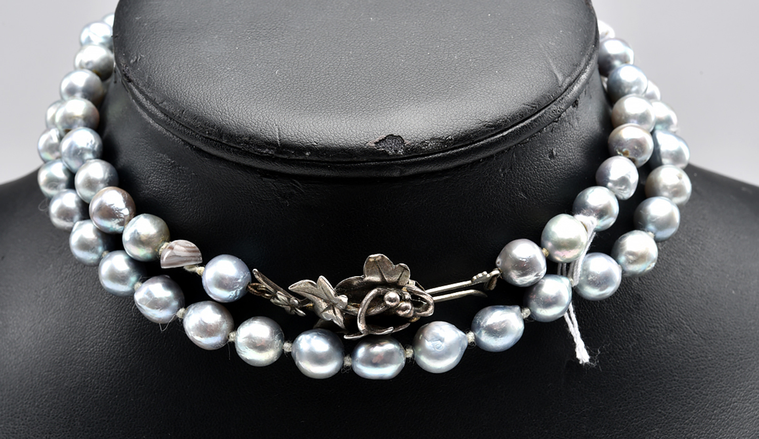 A MATINEE LENGTH STRAND OF SILVER COLOURED CULTURED PEARLS TO A SILVER FOLIATE STYLE CLASP (A/F)