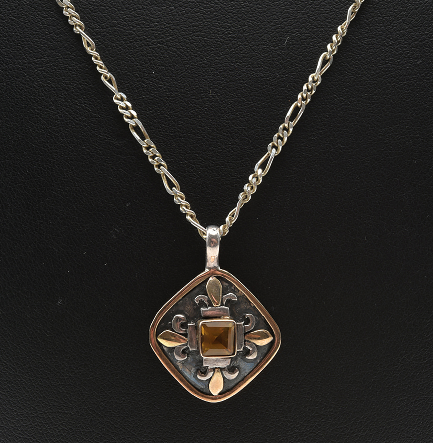 A CITRINE SET PENDANT IN SILVER AND 18CT GOLD TO A STERLING SILVER CHAIN OF 590MM