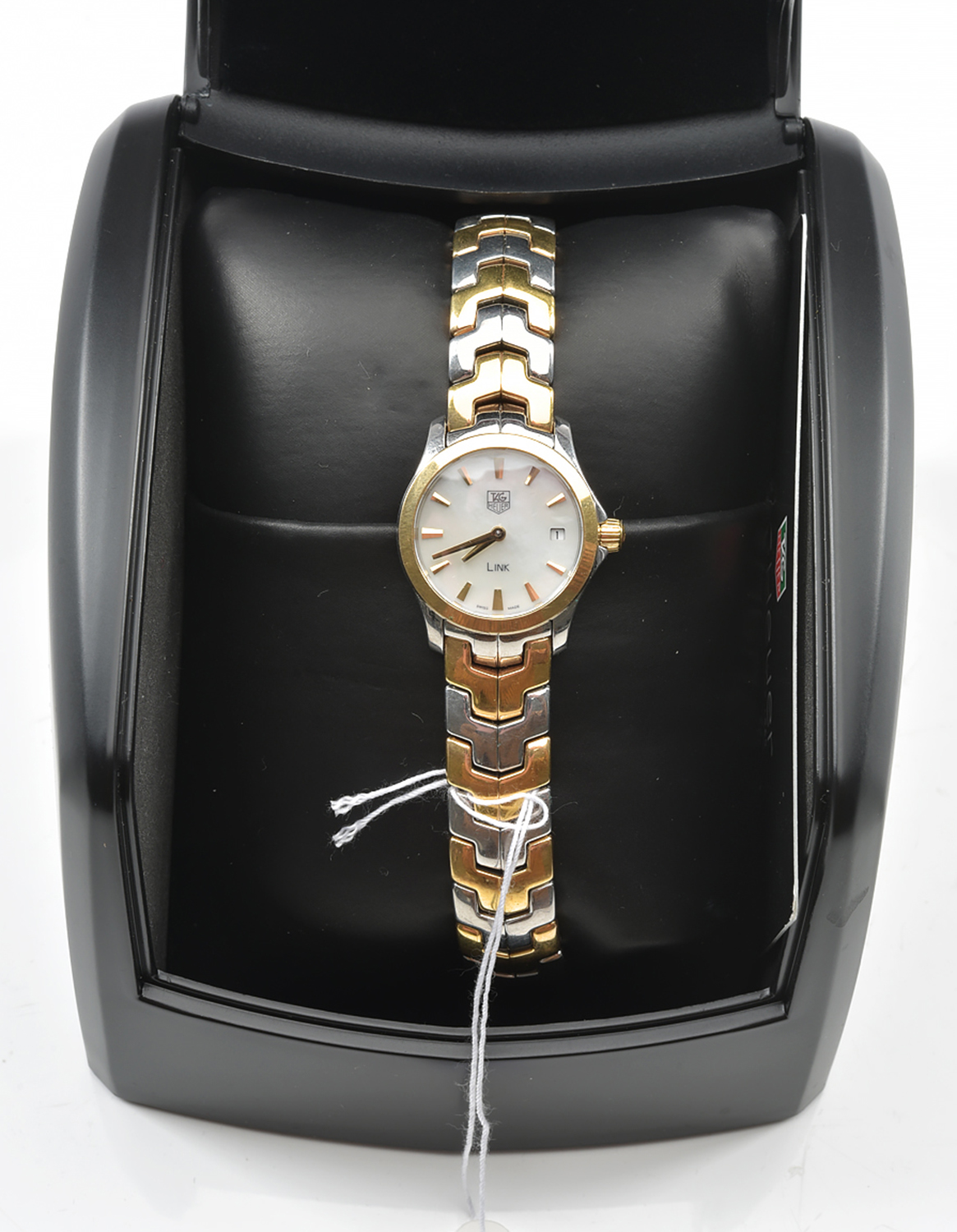 A LADIES TAG HEUER WRISTWATCH WITH MOTHER OF PEARL DIAL IN TWO TONE GOLD, INCLUDING BOX