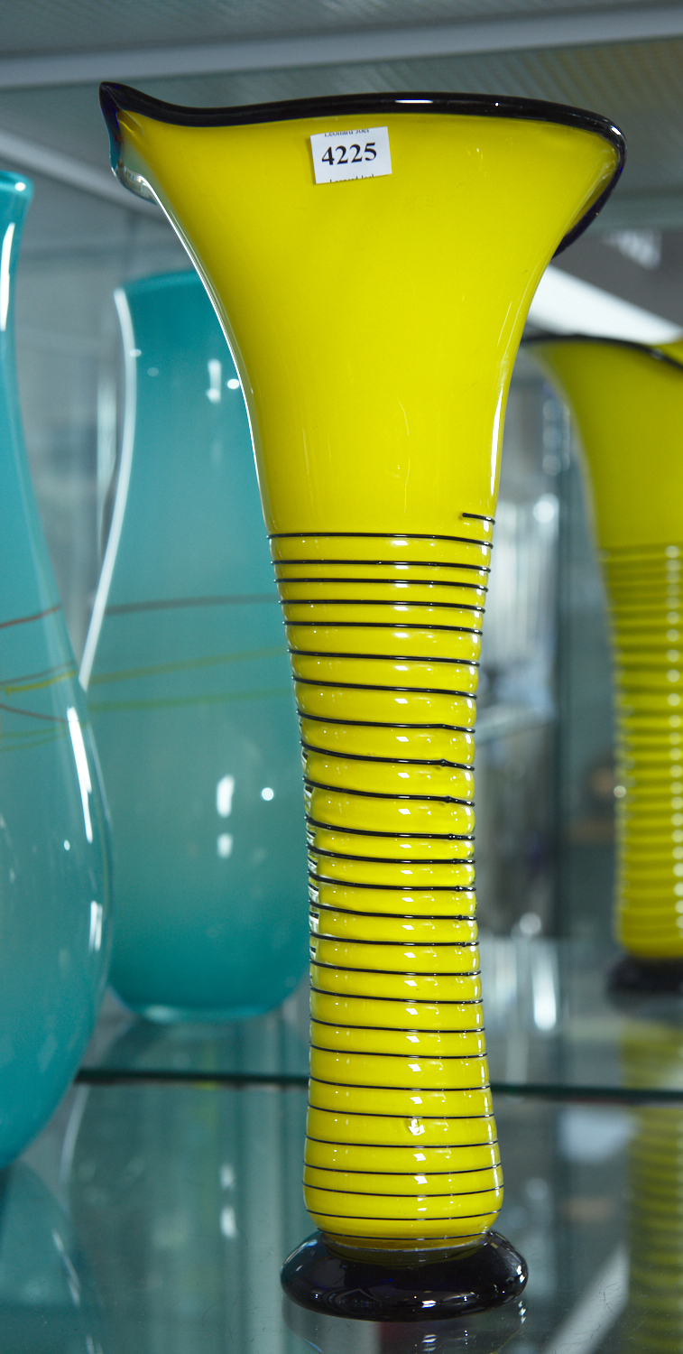 TALL LOETZ STYLE BOHEMIAN YELLOW ART GLASS VASE, APPLIED TRAILING