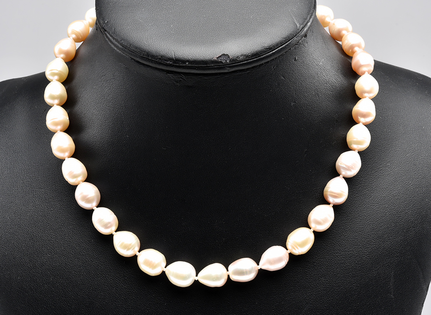 A STRAND OF PEACH FRESHWATER PEARLS TO A SILVER CLASP, LENGTH  450MM
