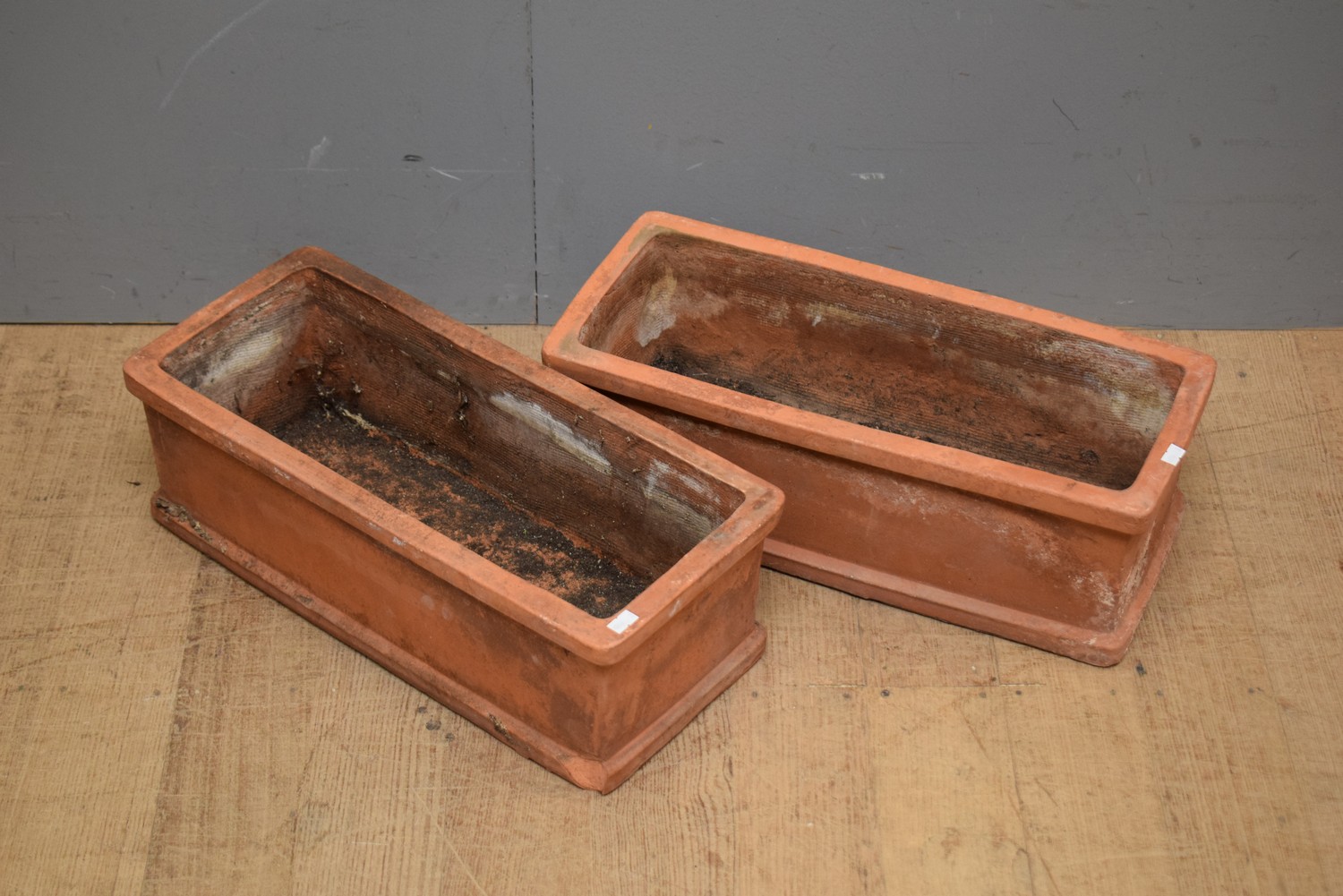 TWO TERRACOTTA PLANTERS (A/F) (17H X 51W X 22D CM)
