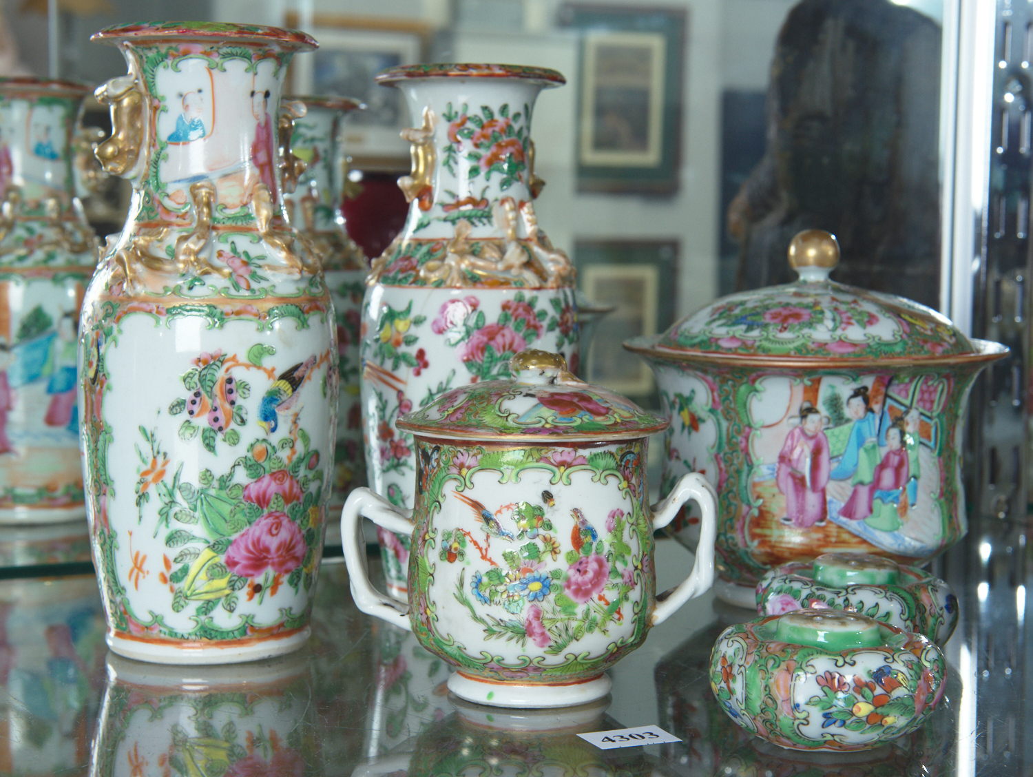 A COLLECTION OF CHINESE EXPORT PORCELAIN INCLUDING A PAIR OF VASES, LIDDED MUG, PAIR OF CRUETS AND A BOWL AND COVER (A/F)