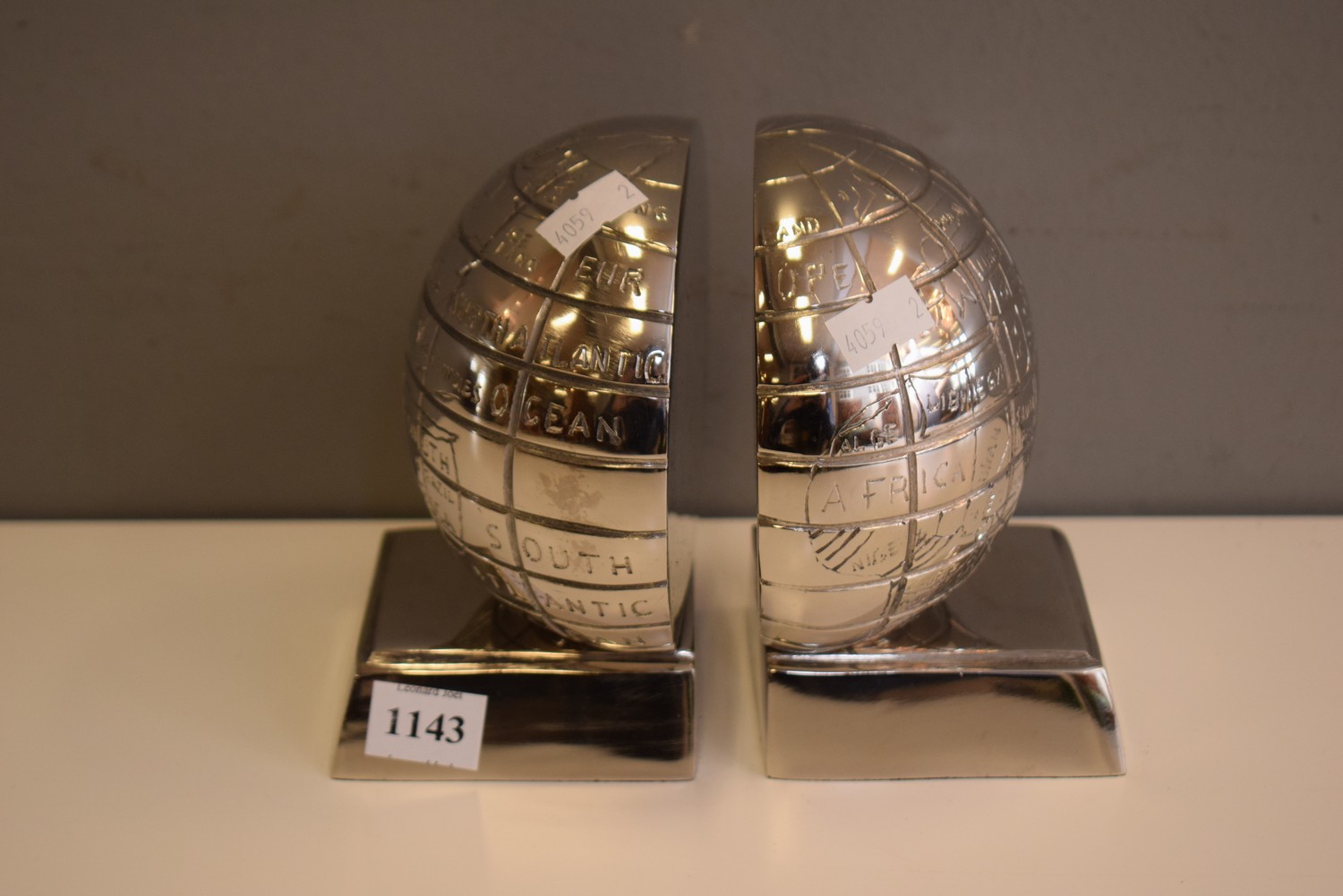 A PAIR OF CHROME GLOBE BOOKENDS (14H X 8D CM)