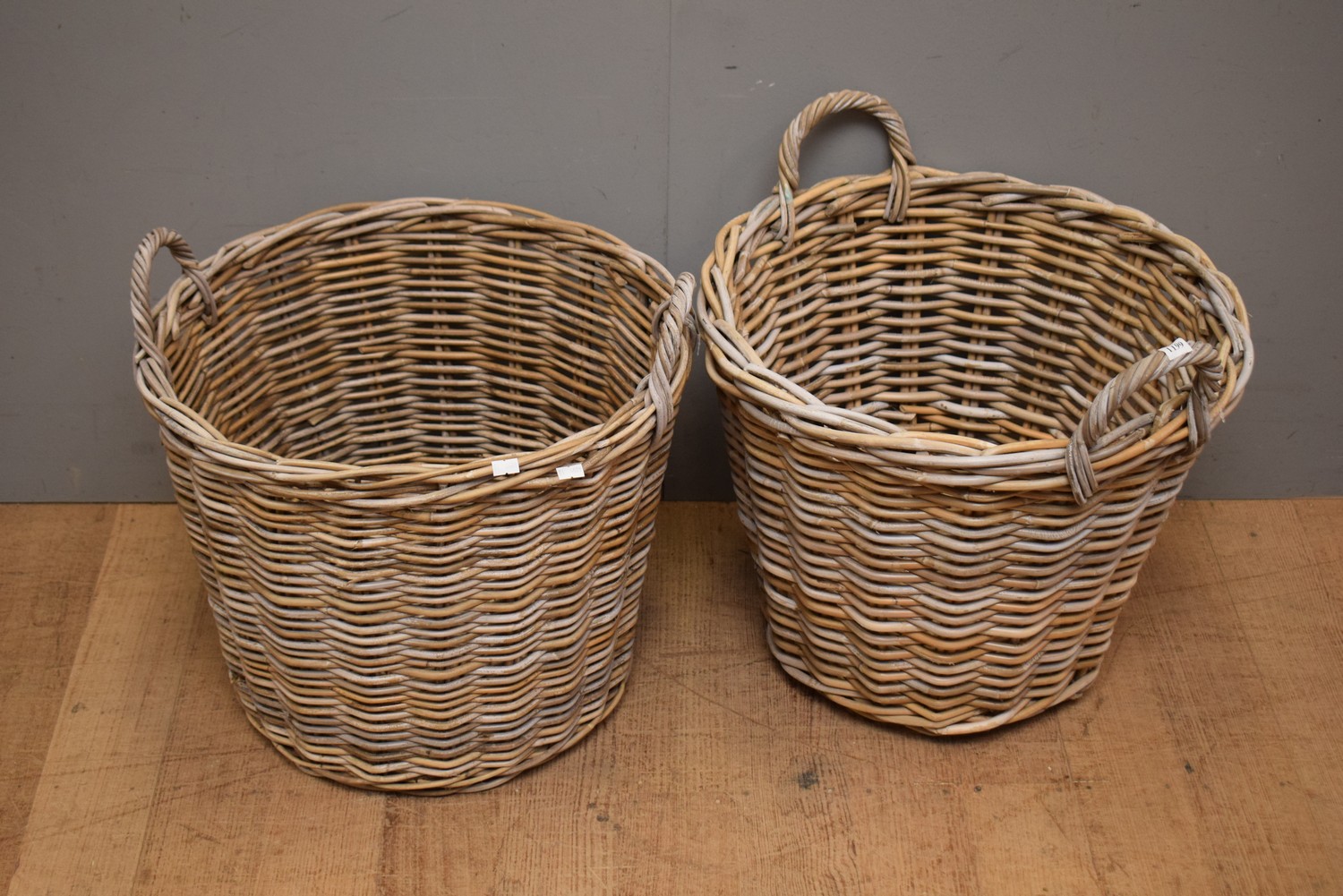 TWO WICKER BASKETS (LARGER 40H X 52D CM)