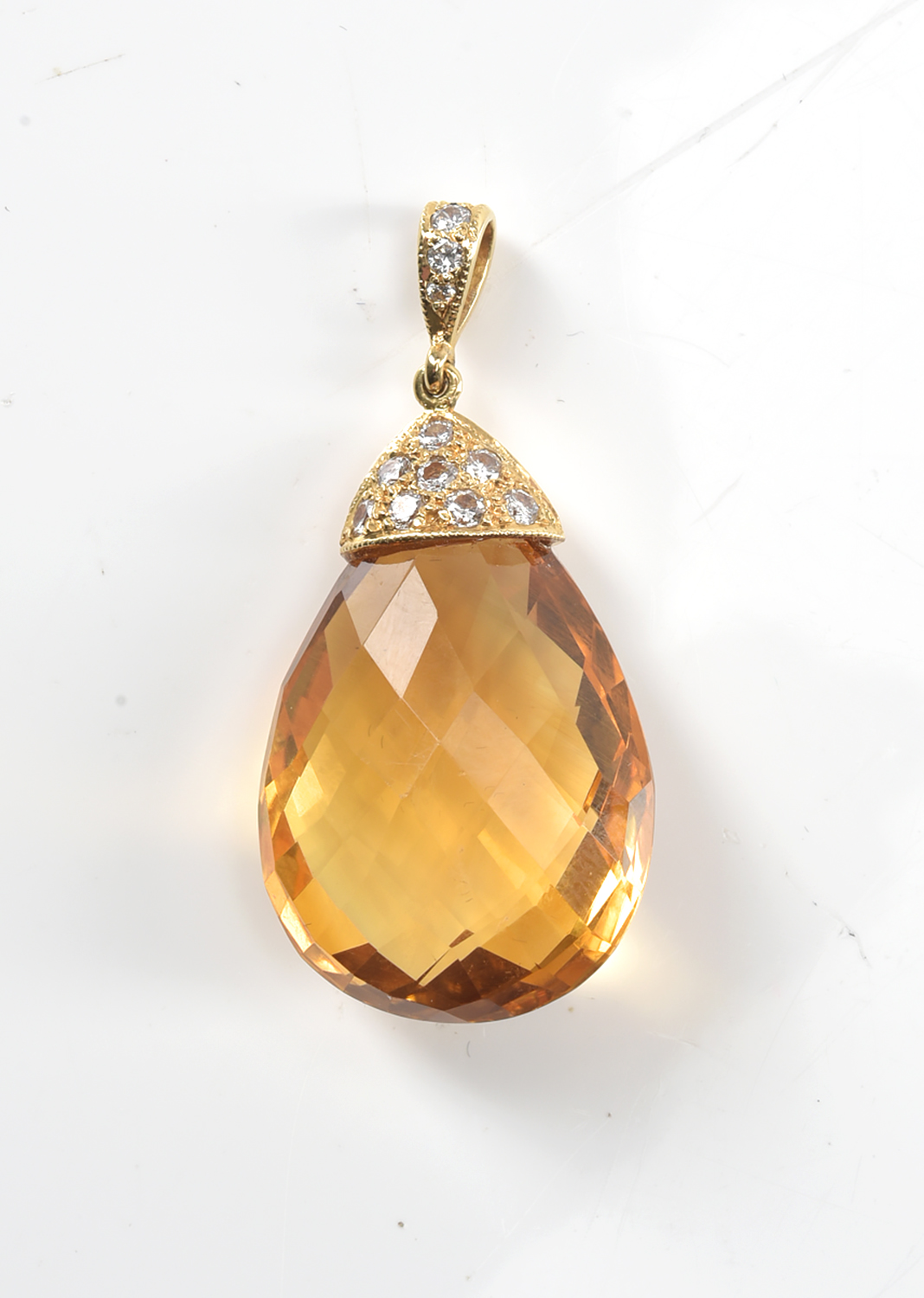 A FANCY PEAR CUT CITRINE AND DIAMOND PENDANT IN 18CT GOLD, TOTAL LENGTH 35MM