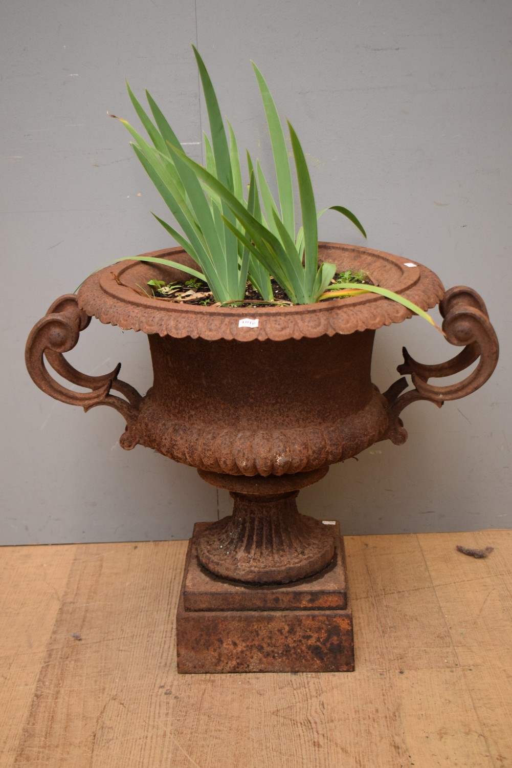 A CAST IRON CLASSICAL STYLE URN (A/F)(PLEASE NOTE THIS HEAVY ITEM MUST BE REMOVED BY CLIENTS OR CARRIERS AT THE CUSTOMERS EXPENSE. LEONARD JOEL STAFF CANNOT ASSIST CARRYING THIS ITEM) (60H X 74D CM)