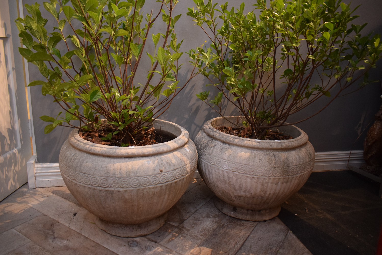 A PAIR OF CLASSICAL STYLE CONCRETE POTS (PLEASE NOTE THESE HEAVY ITEMS MUST BE REMOVED BY CLIENTS OR CARRIERS AT THE CUSTOMERS EXPENSE. LEONARD JOEL STAFF CANNOT ASSIST CARRYING THESE ITEMS) (47H X 66D CM)